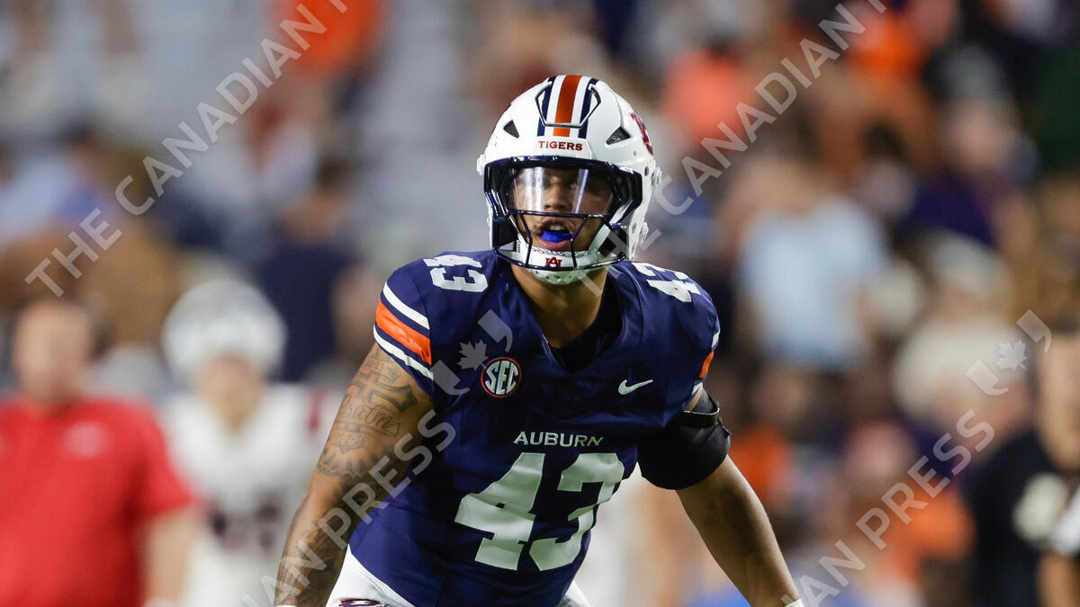 Auburn linebacker Caleb Wheatland (43) defends during the second half of an NCAA football game against Ball State on Saturday, Sept. 6, 2025 in Auburn, Ala. (AP Photo/Stew Milne)