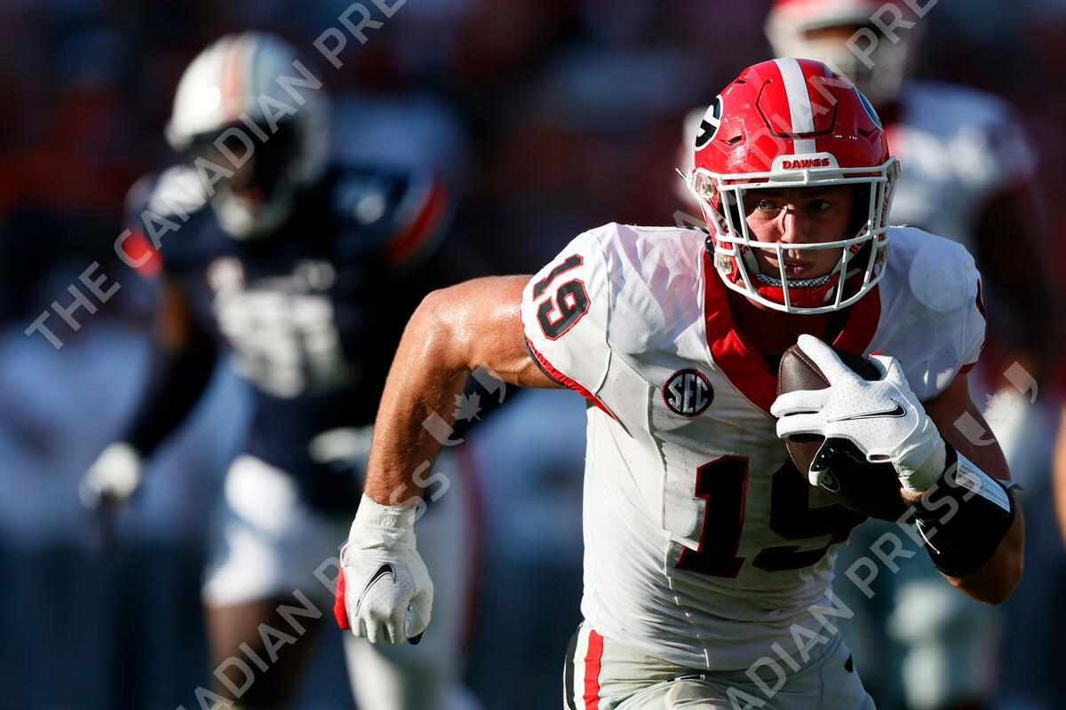 Georgia tight end Brock Bowers (19) carries the ball after a reception during the second half of an NCAA football game against Auburn, Saturday, Sept. 30, 2023, in Auburn, Ala. (AP Photo/ Butch Dill )
