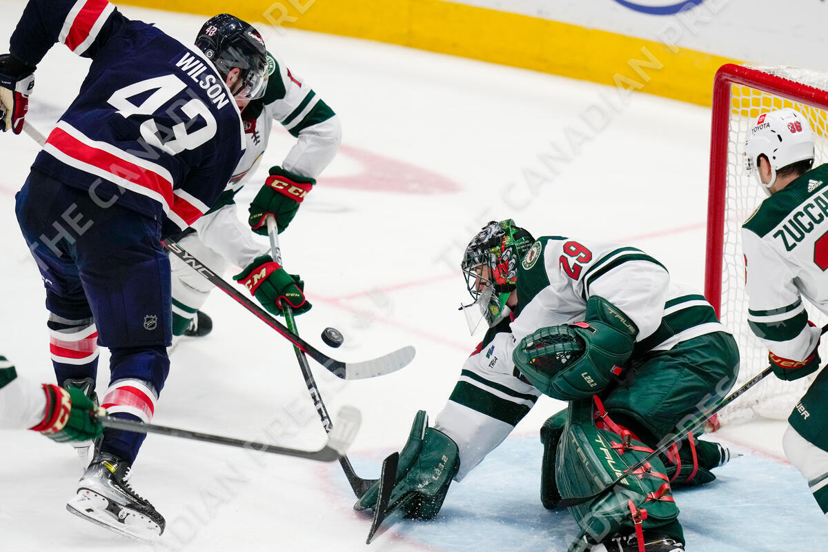 Washington Capitals right wing Tom Wilson (43) tries for the puck as it is deflected by Minnesota Wild goaltender Marc-Andre Fleury (29), as Wild's Brock Faber (7) defends during the second period of an NHL hockey game Friday, Oct. 27, 2023, in Washington. (AP Photo/Alex Brandon)