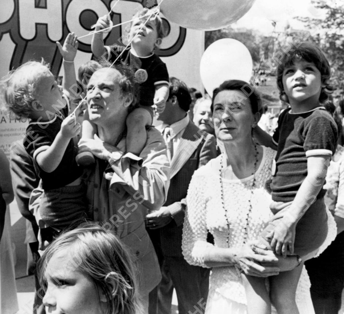 Prime Minister Pierre Trudeau, with sons Michel on his shoulders, Sacha in his arms, and Justin, being held by Lorraine Monk of the National Film Board, enjoy the Photo 77 celebration July 1, 1977, in Ottawa. It was part of the Canada Day festivities honoring Canada's 110th birthday. (CP PHOTO/Mike Ridewood)