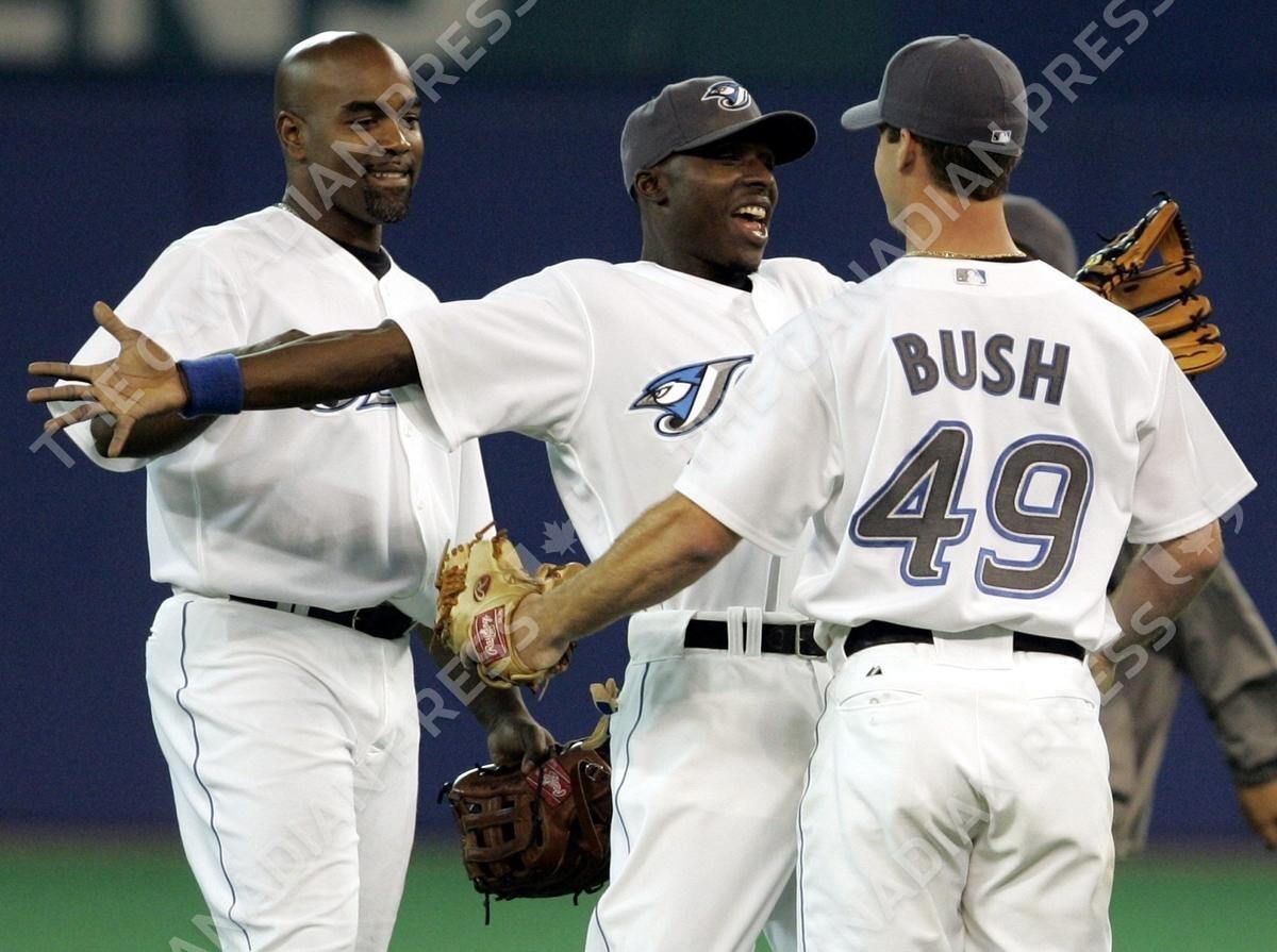 Toronto Blue Jays' starter Dave Bush (right) is congratulated by first baseman Carlos Delgado, left, and gets a hug from second baseman Orlando Hudson, following his complete game shutout against the New York Yankees in Toronto on Friday, October, 1, 2004. Bush struck out 11 as the Jays defeated the AL East champions 7-0. (CP PHOTO/J.P. Moczulski)