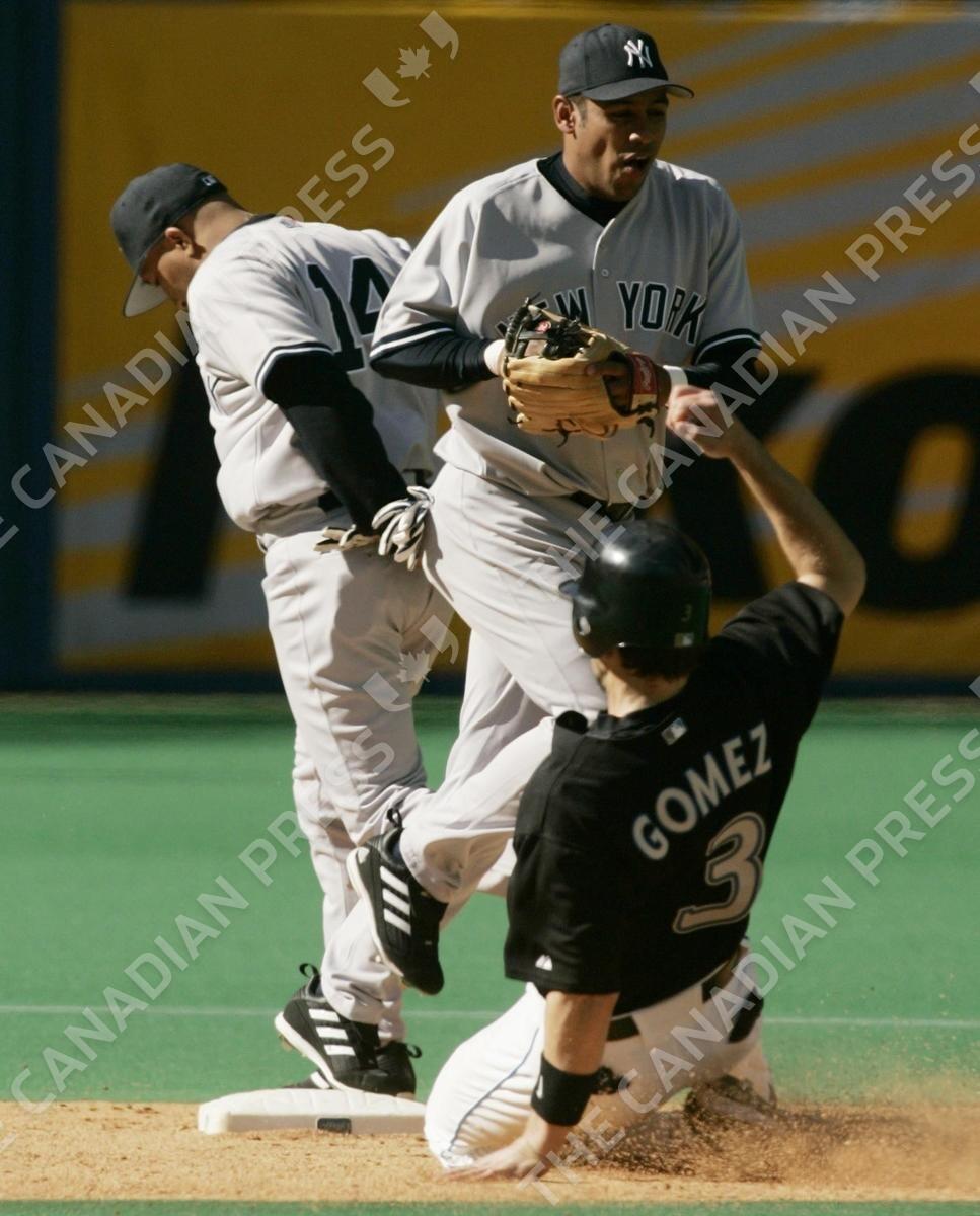 New York Yankees Felix Escalona shortstop tags the plate for the out at second on Toronto Blue Jays Chris Gomez in the sixth inning during AL action in Toronto, Sunday October 3, 2004. The Yankees defeated the Blue Jays 3-2. (CP PHOTO/Adrian Wyld)