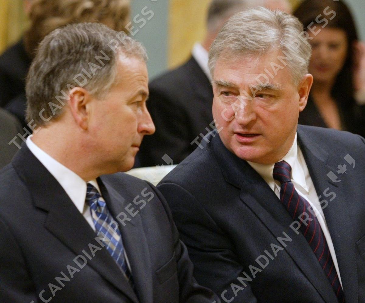 David Emerson (right) and Robert Nicholson (left) speak prior to being sworn in as ministers during ceremonies in Ottawa Monday Feb. 6, 2006. (CP PHOTO/Fred Chartrand)