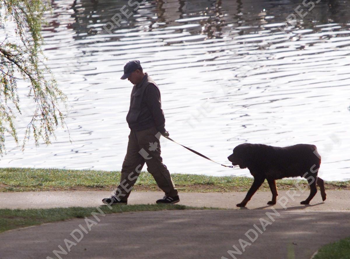 A pair of reluctant-looking walkers make their way along a waterfront path at Panorama Park in North Vancouver Tuesday April 13, 2004. A change in the weather is forecast with weather office calling for rain for the next few days.(CP PHOTO/Chuck Stoody)