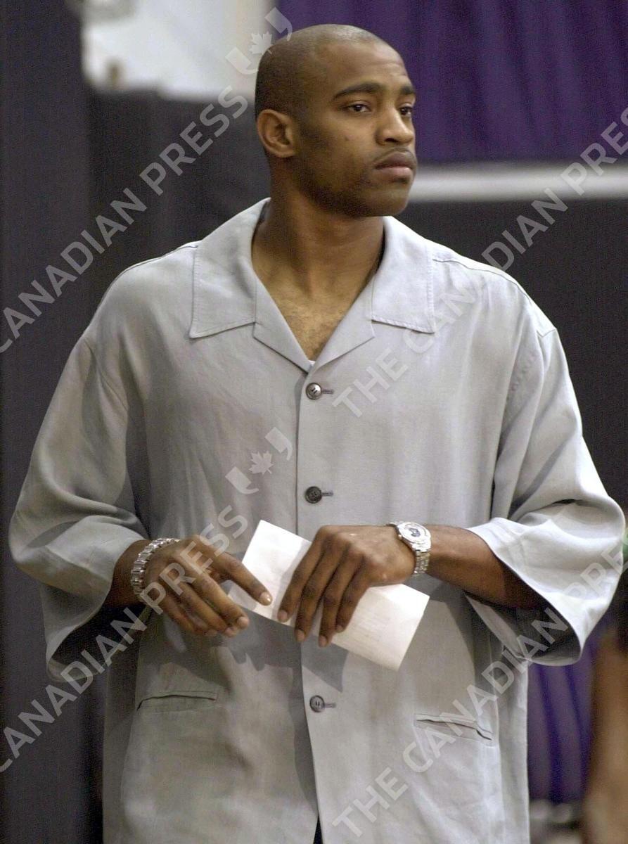 Toronto Raptors Vince Carter arrives at a press conference in Toronto Wednesday August 1, 2001. Carter confirmed he has agreed to a six-year contract extension with the NBA team. (CP PHOTO/Aaron Harris)