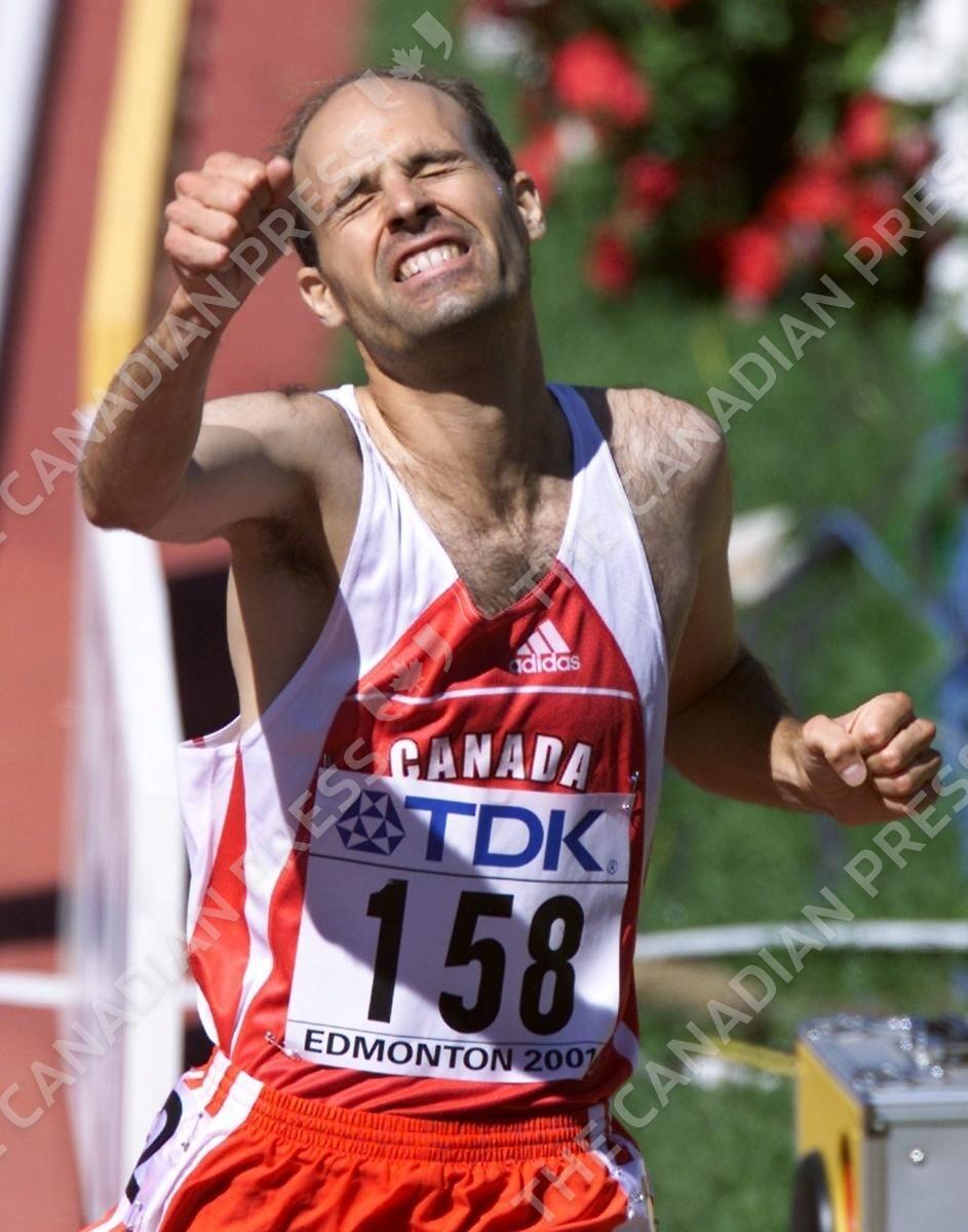 Joel Bourgeois from Moncton, N.B. crosses the finish line of the men's 3000-metre steeplechase heat at the World Track and Field Championships in Edmonton Monday Aug. 6, 2001. Bourgeois was timed in eight minutes 26.92 seconds, a season's best, to leave him 10th among the 15 qualifiers. He qualifies for Wednesday's final. (CP PHOTO/Kevin Frayer)