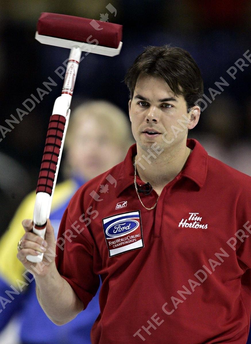 Team Canada's third David Nedohin waves his brush in disgust after missing his throw in the second end of competition against Italy at the World Curling Championships in Victoria, B.C. Wednesday April 6, 2005. Canada won 10-7 and has a 5-3 after twelve draws.(CP PHOTO/Chuck Stoody)