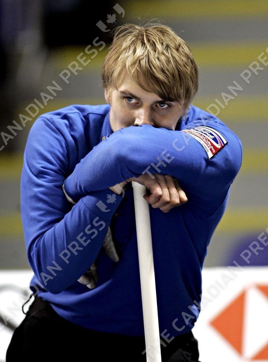 Sweden's skip Eric Carlsen stands dejected after losing to Scotland 5-4 in an extra end at the World Curling Championships in Victoria, B.C. Wednesday April 6, 2005. Sweden is at the bottom of the standings with a record of 1-7.(CP PHOTO/Chuck Stoody)