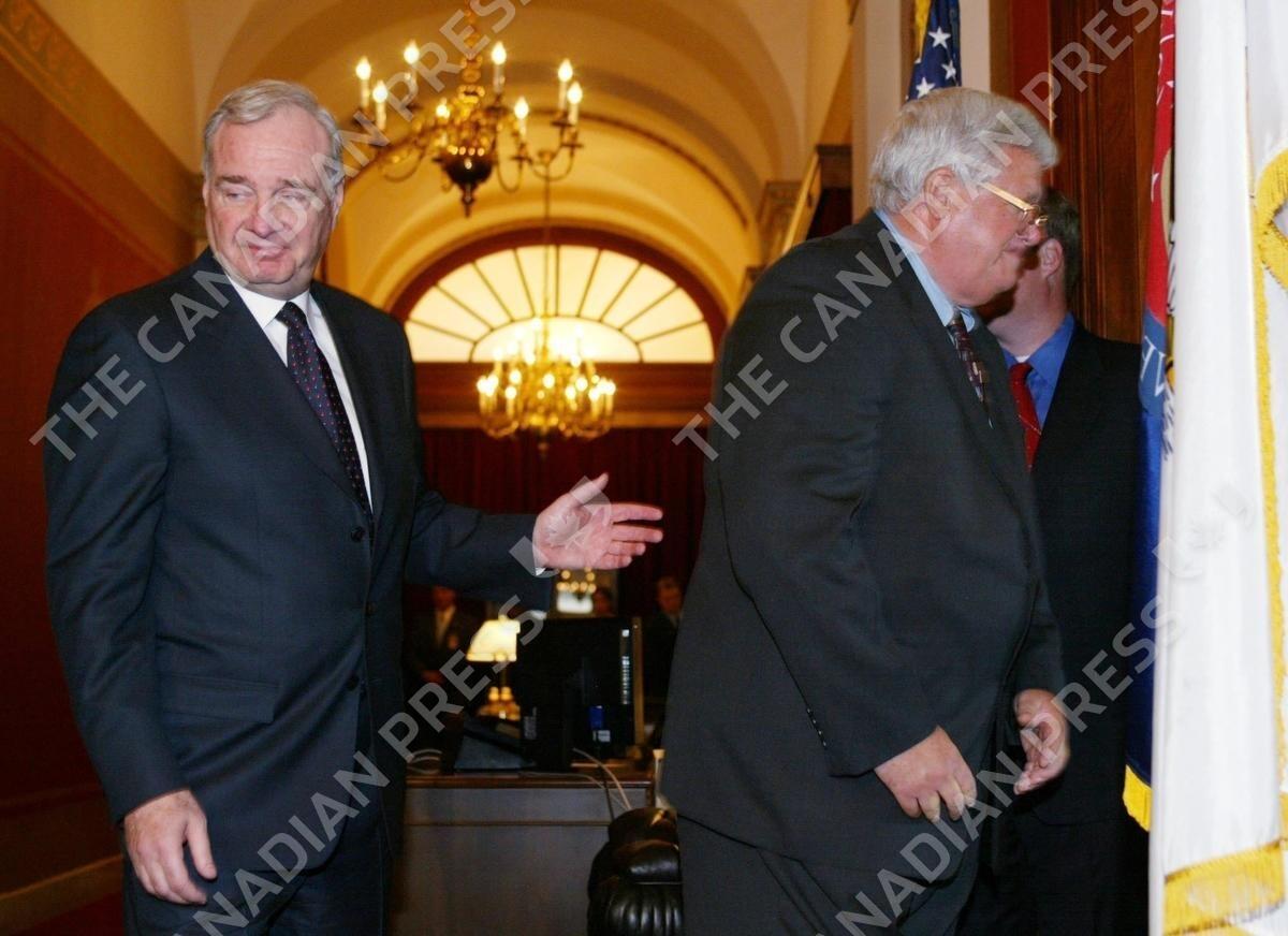 Prime Minister Paul Martin (left) follows Dennis Hastert, Speaker of the House into his office on Capital Hill in Washington, D.C. Thursday April 29, 2004. Martin is in Washington on an offical visti and will meet President Bush on Friday.(CP PHOTO/Jonathan Hayward)