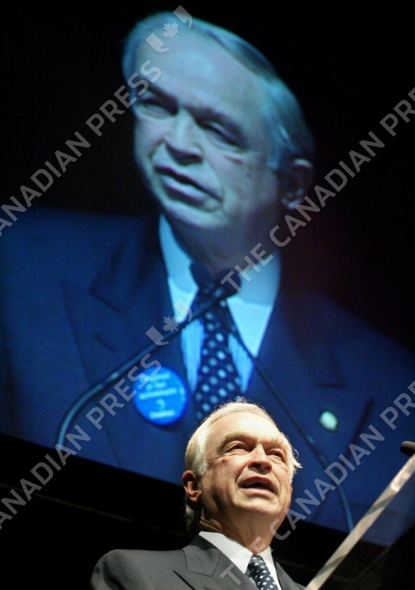Forest company Domtar CEO Raymond Royer addresses the company's annual meeting in Montreal, Thursday, April 29, 2004. Shares in the forest products company climbed 40 cents to $16.00 after the firm said the restructuring of its Canadian papermaking operations will eliminate 415 jobs but should result in annual savings of $50 million. (CP PHOTO/Paul Chiasson)