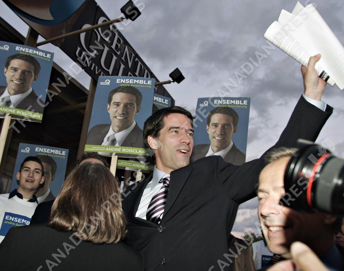 Parti Quebecois leadership candidate Andre Boisclair waves to supporters as he arrives to participate at the public debate with the eight candidates for the Parti Quebecois leadership in Sherbrooke, Quebec Wednesday Sept. 21, 2005. (CP PHOTO/Jacques Boissinot)