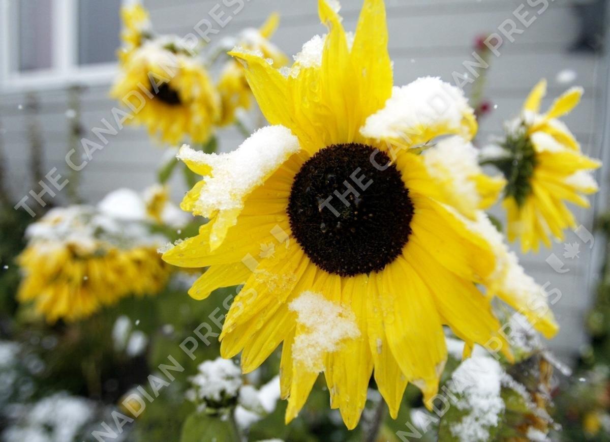 A sun flower bends with the weight of snow near Cremona, Alta., on Thursday, Sept. 23, 2005. Rain turned to snow in this central Alberta village but sunny skies are predicted for the rest of the week.(CP PHOTO/Jeff McIntosh)