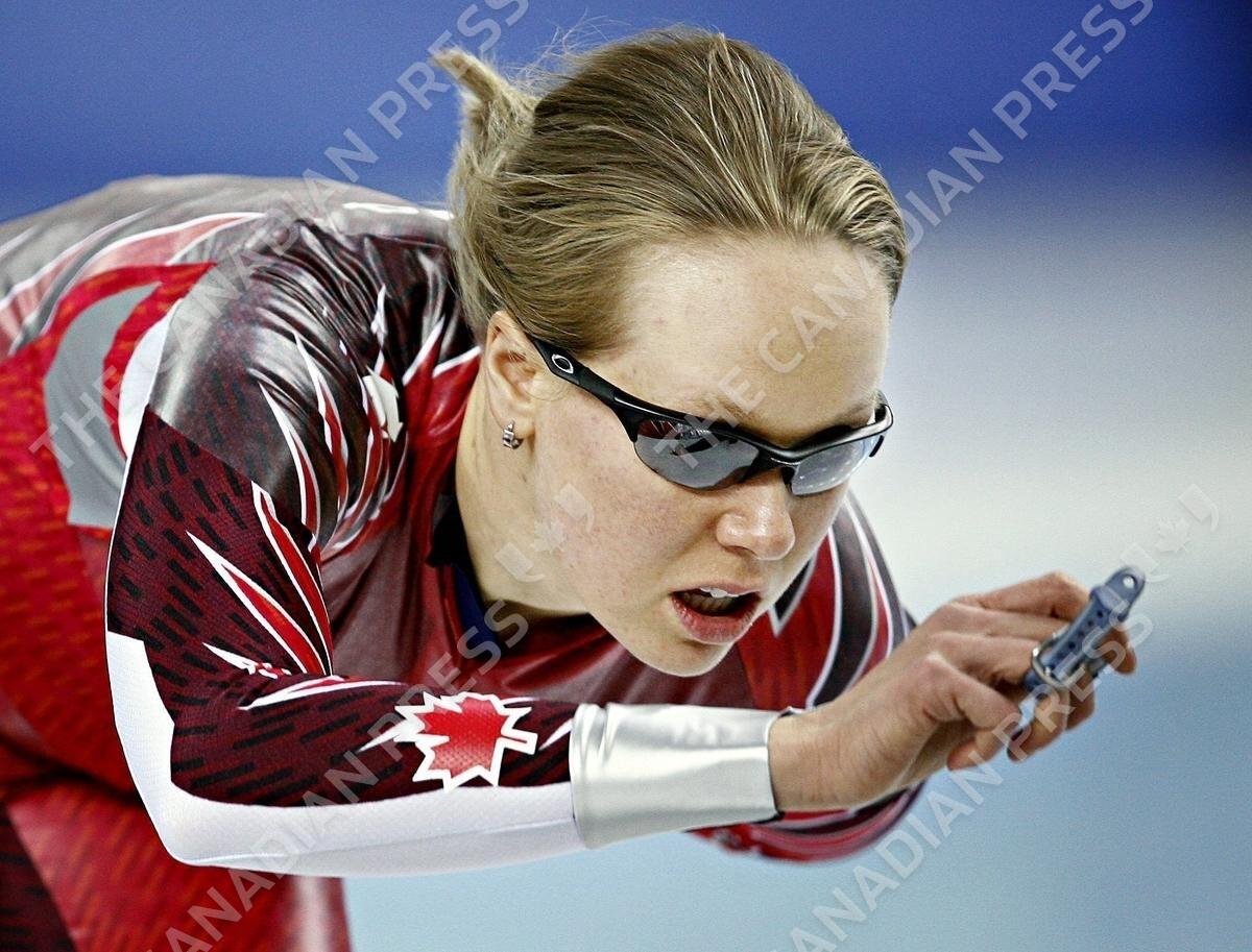 Cindy Klassen from Winnipeg rounds the oval during a speed skating practice session Wednesday, Feb. 8, 2006 in Turin. The XX Olympic Winter Games open in Turin on Frida, Feb. 10, 2006. (CP PHOTO/Paul Chiasson)