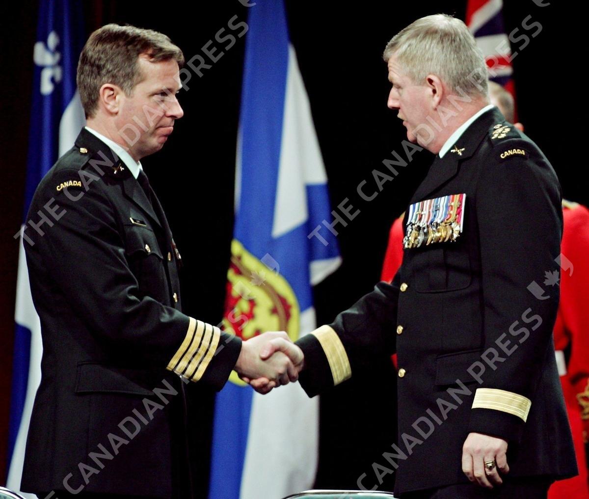 Chief of Defence Staff, General Rick Hillier (right) shakes hands with Colonel David Barr, Commander, Canadian Special Operations Forces Command during a Canadian Forces transformation ceremony in Ottawa Tuesday, Jan. 31, 2006. (CP PHOTO/Jonathan Hayward)