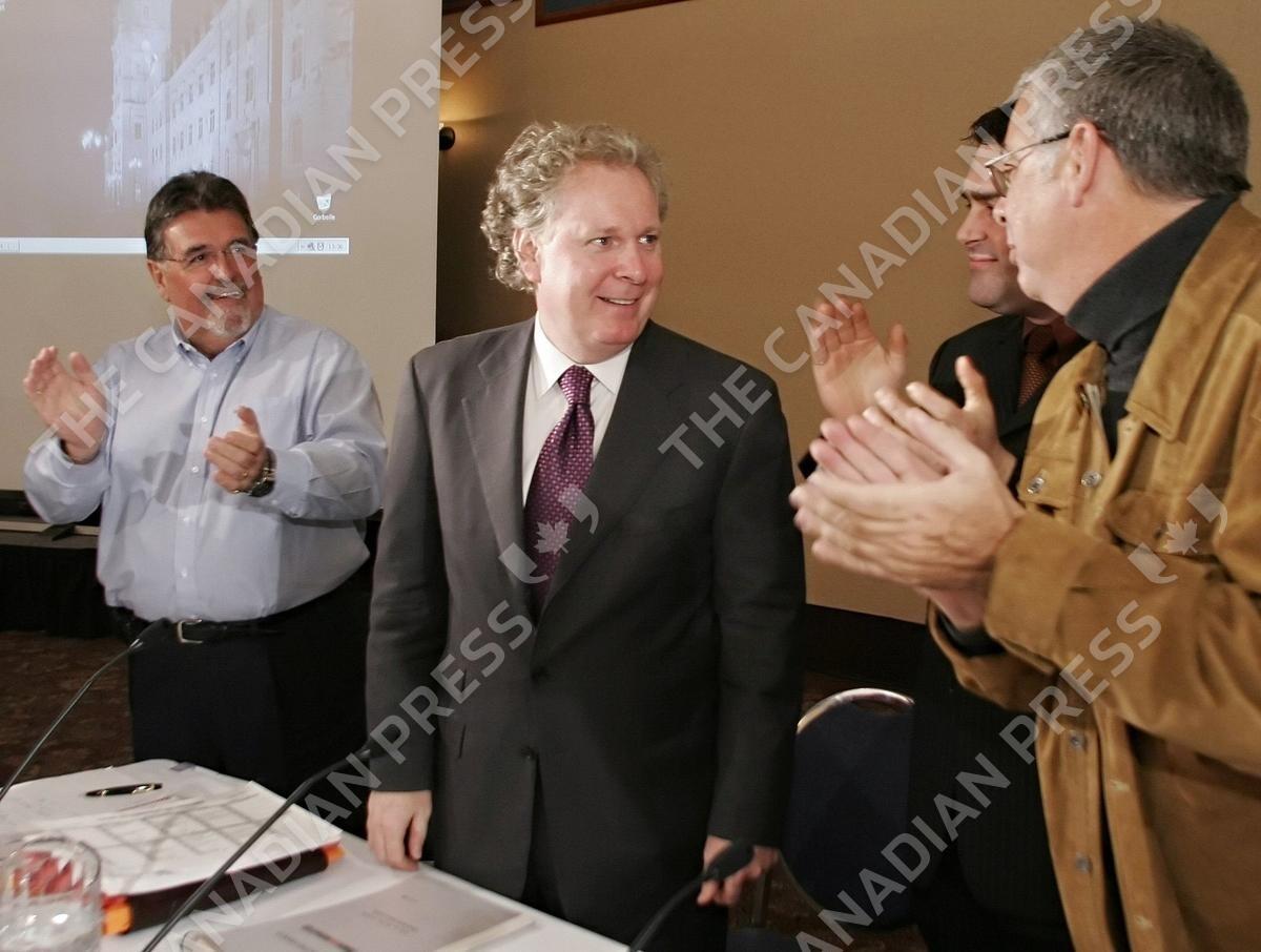 Quebec premier Jean Charest is applauded by his Liberal caucus as he arrives for a two-day Quebec Liberal caucus at St-Georges-de-Beauce, south of Quebec City, Tuesday Feb. 7, 2006. From left to right: Norm MacMillan, Jean Charest, David Whissell and Jacques Dupuis. (CP PHOTO/Clement Allard )