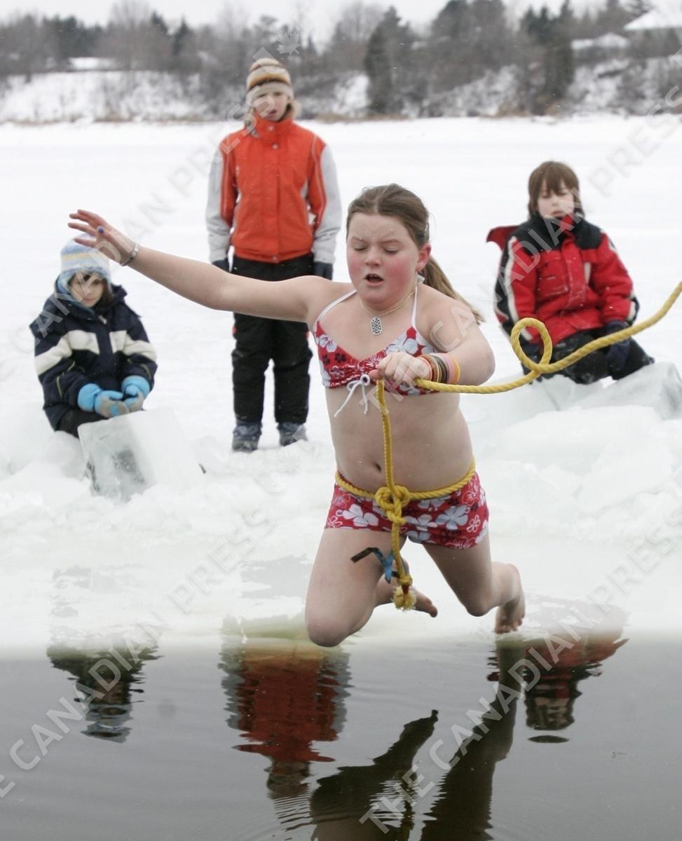 Emily Devenz, 10, jumps into the icy water during the annual New Years Day polar bear dip at Mooney's Bay in Ottawa Sunday, Jan. 1, 2006.(CP PHOTO/Jonathan Hayward)