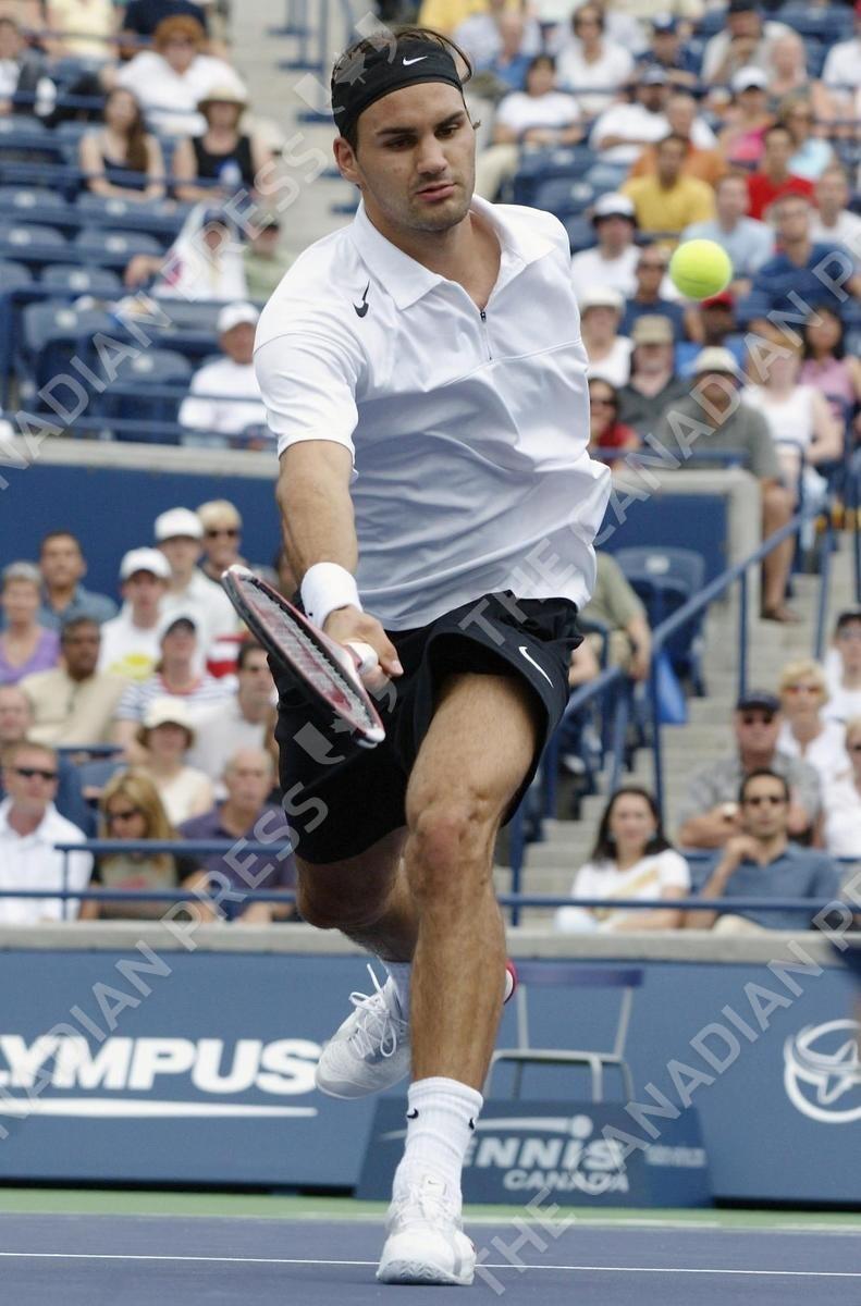 Roger Federer of Switzerland hits a volley on his way to defeating Thomas Johansson of Sweden 4-6, 6-3, 6-2 in their semi-final match at the Tennis Masters Series Canada tournament in Toronto on Saturday July 31, 2004. (CP PHOTO/Frank Gunn)