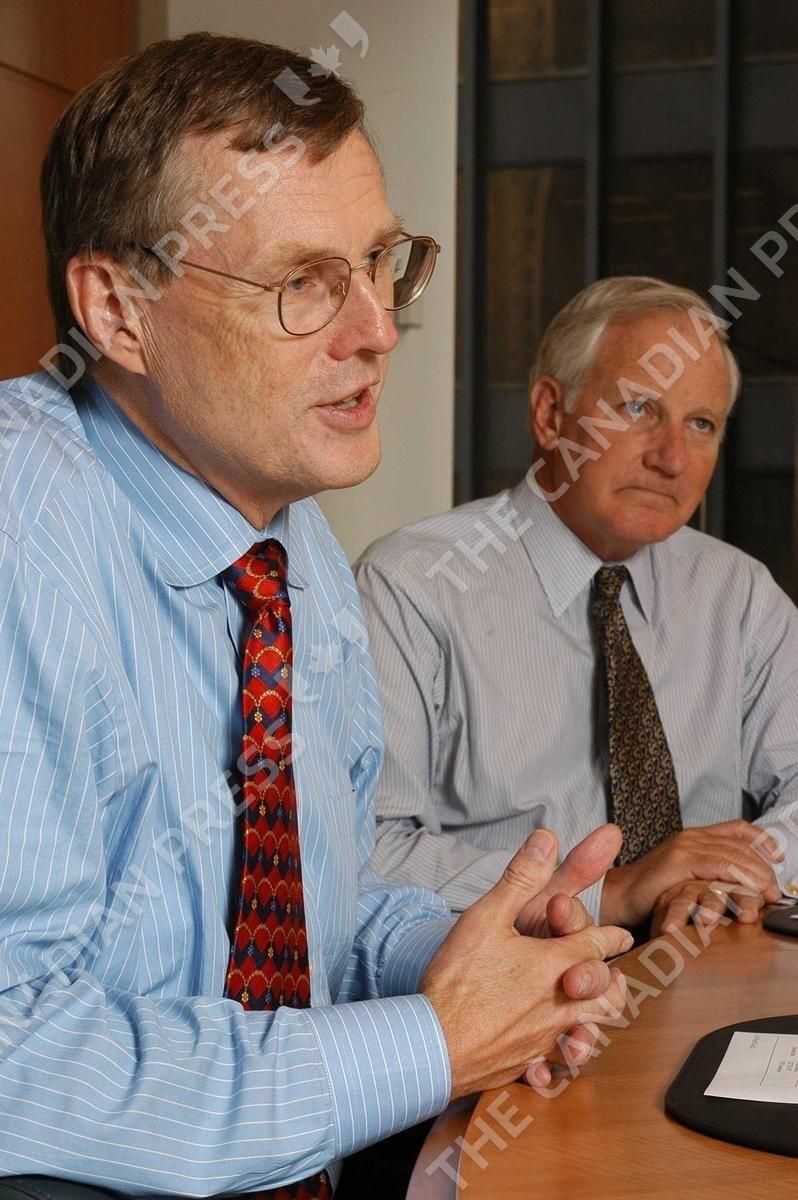 Ed Clark (left), TD Bank President and CEO, and Bill Ryan, Banknorth Group, Inc. Chairman, President and Chief Executive Officer, meet in Toronto, Thursday, August 26, 2004. TD Bank has unveiled a $5-billion takeover of a majority stake in Banknorth of New England (CP PHOTO/Derek Oliver)