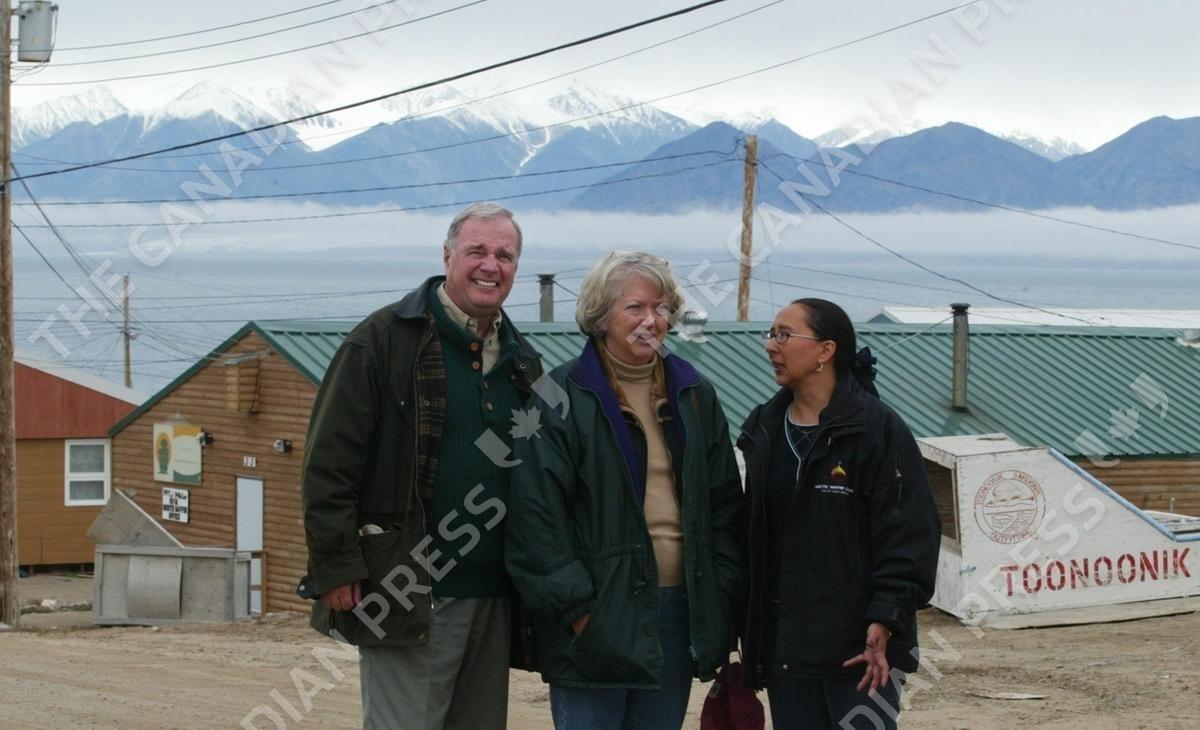 Prime Minister Paul Martin along with his wife Sheila and Artic M.P. Nancy Karetak Lindell (left to right)take a tour small Artic community of Pond Inlet during a tour of Nunavut, Wednesday Aug. 11, 2004.(CP PHOTO/Fred Chartrand)