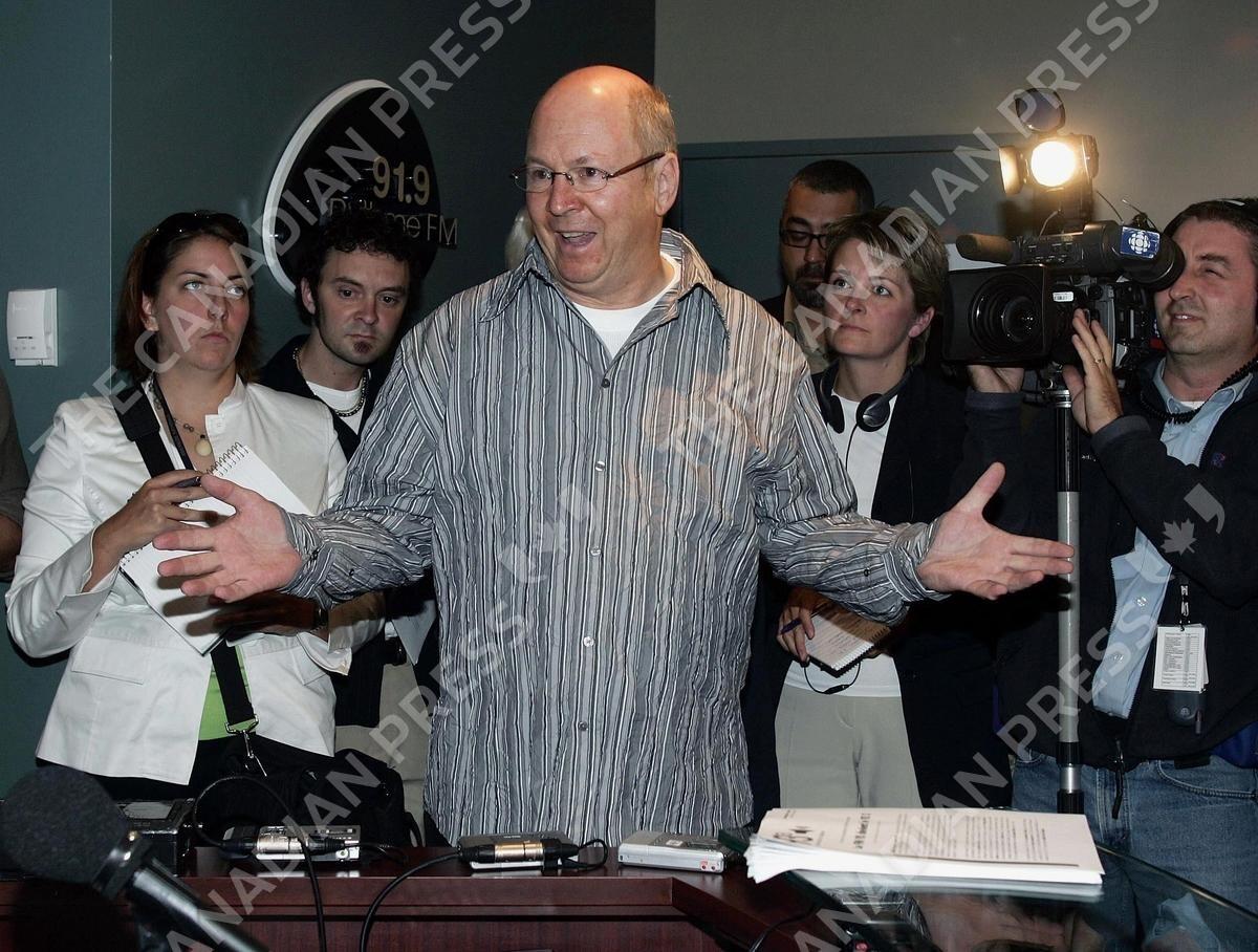 Robert Gillet, the Quebec City radio morning man convicted of paying for sex with 17-year-old prostitute, gestures as the radio station announces his re-hiring during a news conference Thursday Sept. 2, 2004 in Quebec City. Gillet, whose arrest and trial in a teen prostitution case faced so much public scrutiny in Quebec City that his trial had to be moved to Montreal, will be back on the air on CJMF at 7 a.m. on Tuesday. (CP PHOTO/Jacques Boissinot)