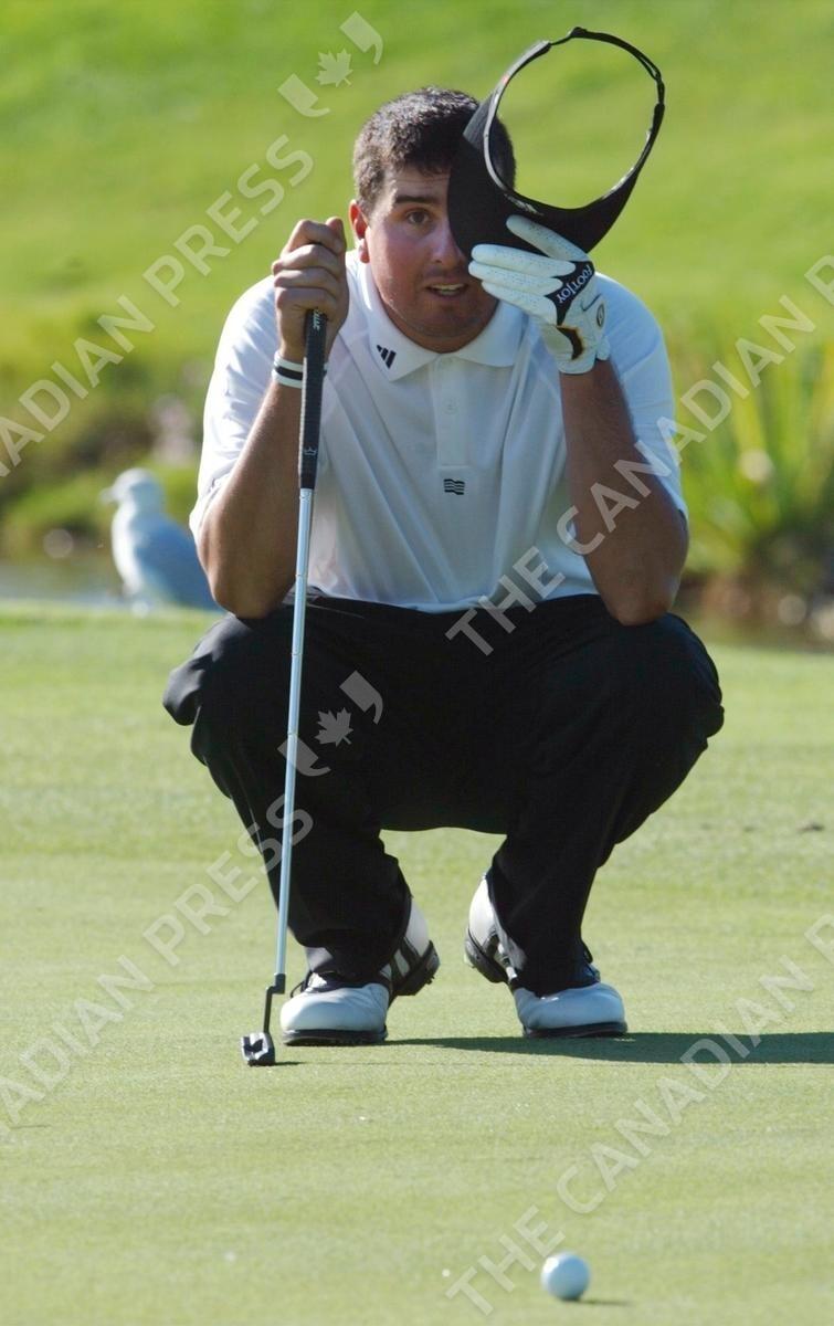 Pat Perez of Scottsdale, AZ uses his cap as he lines up a putt during first round action at the Canadian Open golf tournament in Oakville, Ont. on Thursday September 9, 2004. Perez sits at three under par in second place for all who have finished their round. Play was suspended for half the field due to darkness. (CP PHOTO/Frank Gunn)