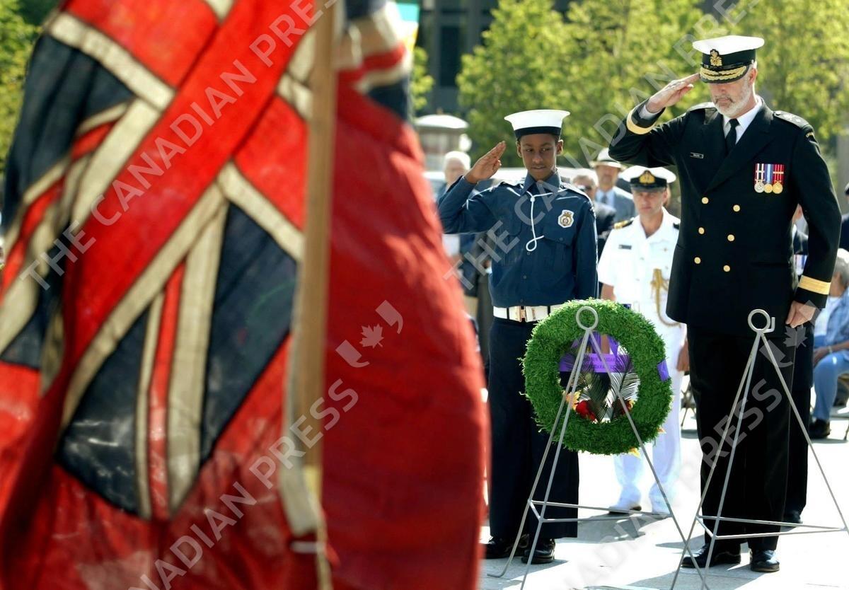 Commodore Denis Rouleau (right) and 12-year-old Navy league Cadet Habil Mohamed salute after laying a wreath on behalf of the Canadian Forces during a wreath laying ceremony at the National War Memorial in Ottawa on Friday Sept. 3,2004. The wreath laying ceremony marked the first anniversary year of the Merchant Navy Veterans Day of Rememberance and the 65th Anniversary of the Sinking of the passenger liner SS Athena.