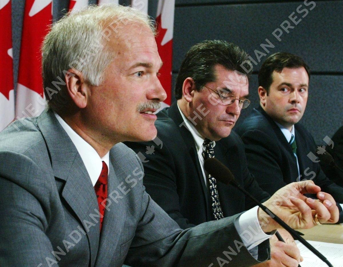New Democratic Party Leader Jack Layton (left to right) speaks at a joint news conference in Ottawa Tuesday, May 18, 2004 with Bloc Quebecois MP Michel Guimond and Conservative Party MP Jason Kenney in response to the Liberal party's closing down of the Commons Public Accounts Commitee investigating the sponsorship scandal.(CP PHOTO/Fred Chartrand)