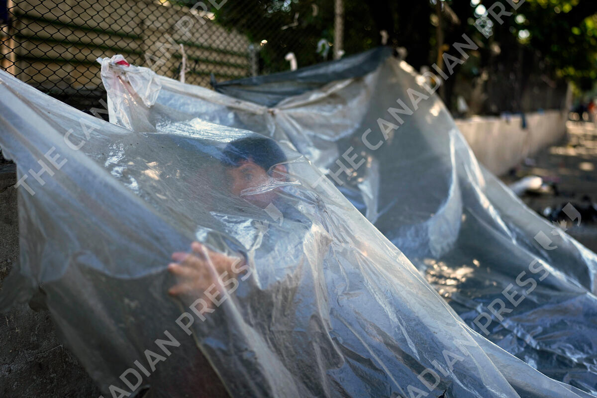 Pablo Fernandez, an Mb'a Indigenous man from Caaguazu, stands under plastic that is part of an encampment outside the National Indigenous Office (INDI) where an Indigenous group is demanding food aid in Asuncion, Paraguay, Friday, April 28, 2023. Paraguay's general elections are scheduled for April 30. (AP Photo/Jorge Saenz)