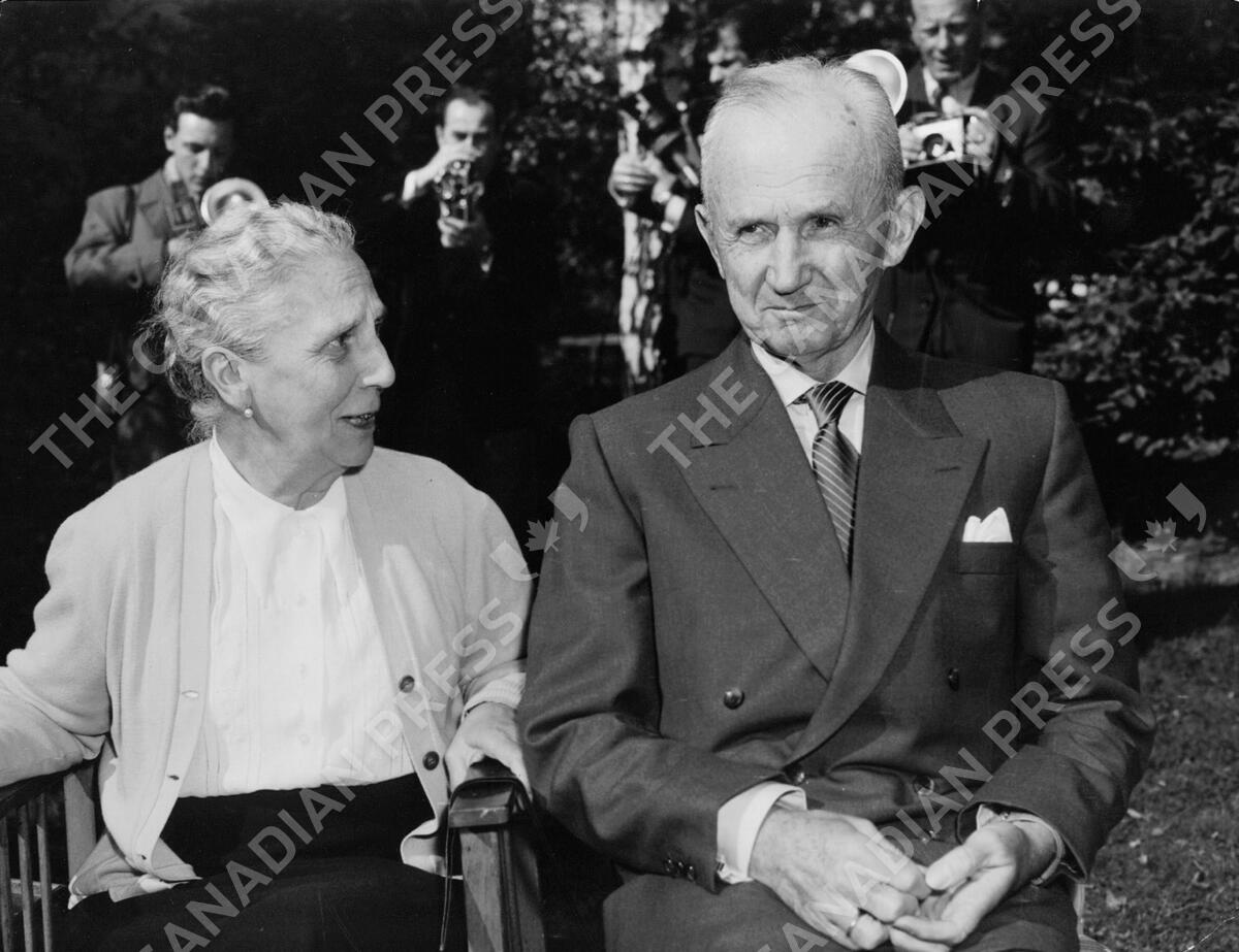 Doenitz freed from jail - Former admiral Karl Doenitz could leave the Berlin-Spandau jail after a sentence of 10 years on Oct. 1, 1956. At the same day, he spoke to newsmen in the garden of a friend. Here, hes viewed with his wife Inge. When leaving the prison, the police didnt admit photographers. (10/01/1956)(AP Photo)