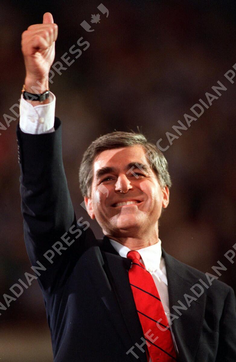** FILE ** In this July 21, 1988 file photo, Democratic presidential candidate Michael Dukakis gives a thumbs up as he arrives for his acceptance speech at the Democratic National Convention in Atlanta. For all its spectacle and optimism, the Democratic convention is haunted. Ghosts of elections past are walking the Pepsi Center's corridors this week, greeting old friends, even holding a luncheon. Years ago they won the prize that Barack Obama will claim on Thursday. But their names and deeds are dusty artifacts to young Americans, and to many older voters, they conjure up campaign debacles that helped Republicans paint the Democratic Party as too liberal, wimpy and egg-headed. (AP Photo/Peter Southwick, File)
