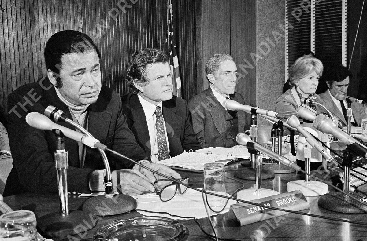 **FILE**In this Dec. 23, 1976 file photo, Sen. Edward Kennedy, second from left, Sen. Edward Brooke, left, Sen. Claiborne Pell and Mass. Rep. Margaret Heckler, right, shown at a hearing on the broken-up Liberian oil tanker Argo Merchant in Boston. Former six-term Rhode Island Sen. Claiborne Pell has died after a long battle with Parkinson's Disease Thursday Jan. 1, 2009. He was 90. Pell, a Democrat, is best known for the grant program in his name that has helped millions attended college. (AP Photo/MSG, File)