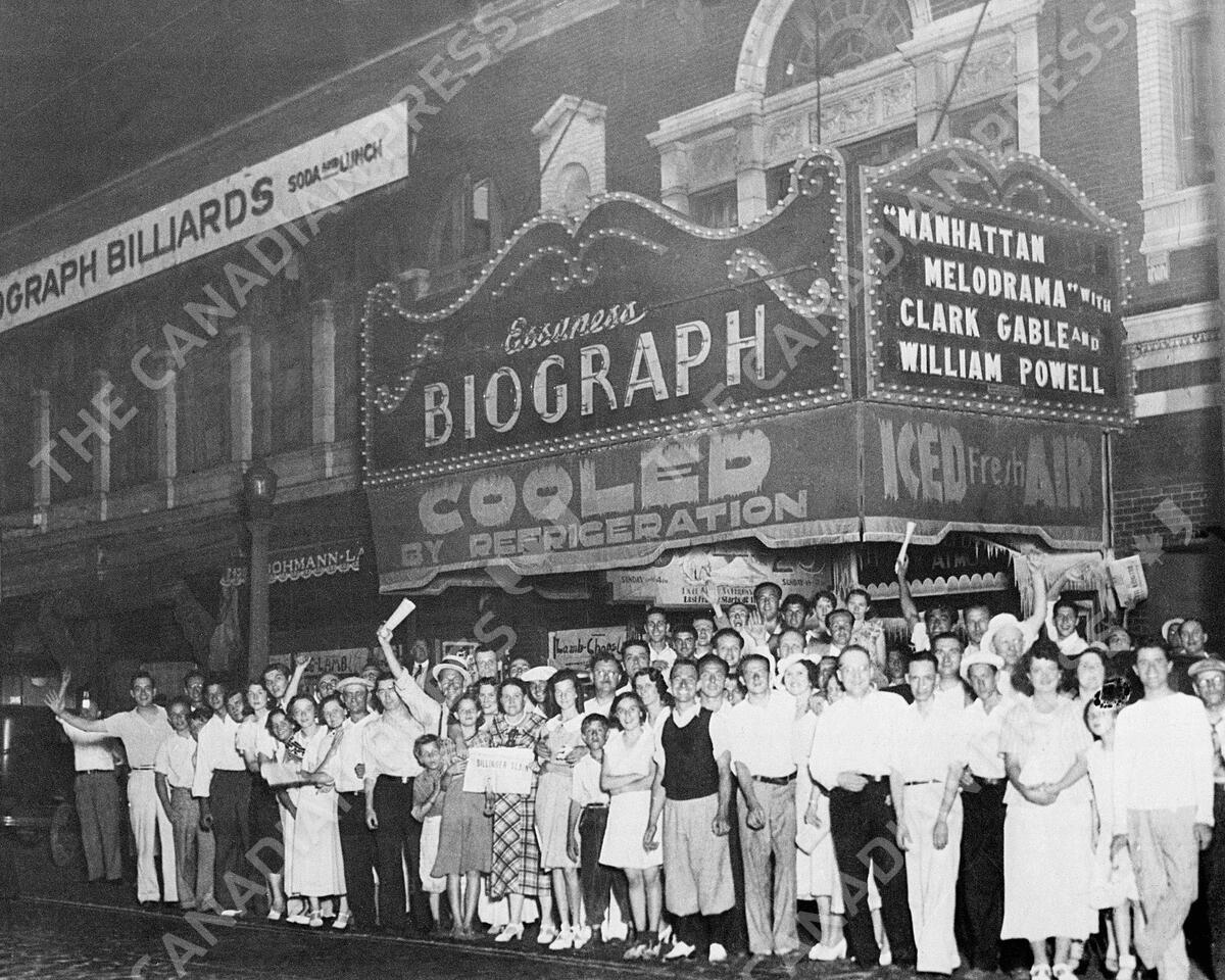 FILE - In this July 21, 1934 file photo, people pose in front of the Biograph Theater on N. Lincoln Avenue in Chicago as one woman displays the newspaper headline "Dillinger Slain." Outlaw John Dillinger was shot and killed by federal agents outside the movie theater after watching the feature "Manhattan Melodrama." The film "Public Enemies" being released July 1, 2009, stars Johnny Depp as Dillinger, who drove the same streets, burst out of the same buildings and emerged from the same theater and pretended to die in the same alley where the feds plugged Dillinger more than 70 years ago. (AP Photo, File)