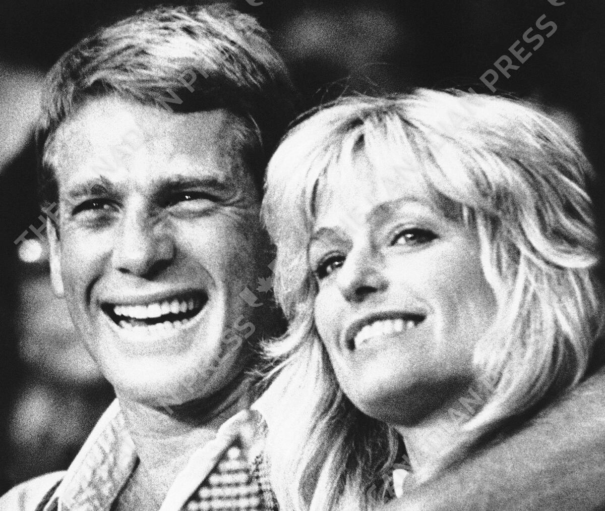 FILE - In this Aug. 12, 1985 file photo, actor Ryan ONeal, left, and actress Farrah Fawcett smile while sitting ringside at the Hollywood Palladium where a trio of U.S. Olympic boxers celebrated the one-year anniversary of their gold medal winning performances in Los Angeles, Calif. Fawcett died Thursday, June 25, 2009 in a Los Angeles hospital. She was 62. (AP Photo/Steve Dykes, file)