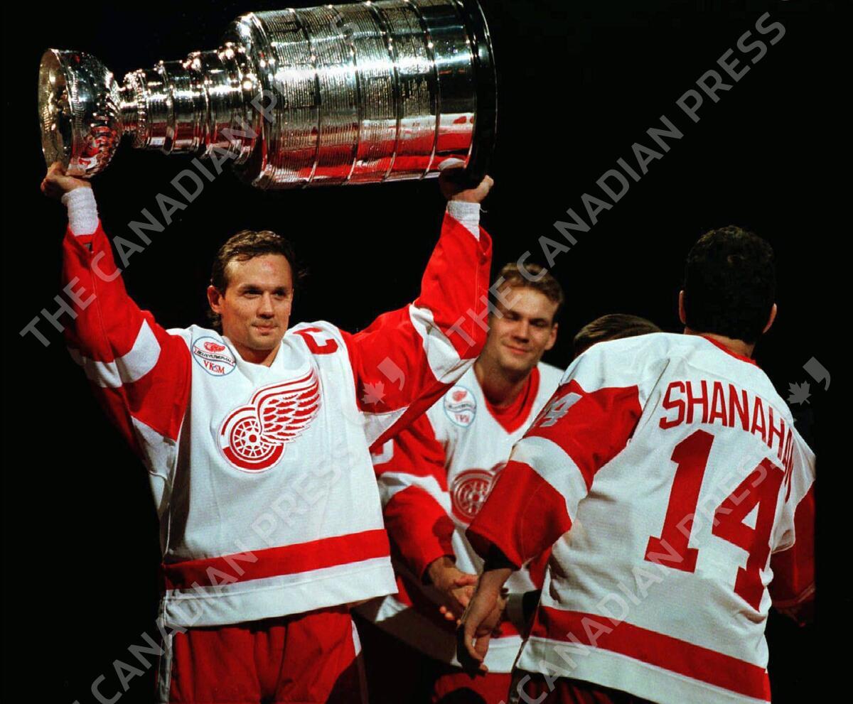 Detroit Red Wings captain Steve Yzerman holds up the Stanley Cup during a ceremony before the start of their game against the Dallas Stars, Wednesday, Oct. 8, 1997. Joining Yzerman are Nicklas Lidstrom, center, and Brendan Shanahan (14). (AP Photo/Tom Pidgeon)