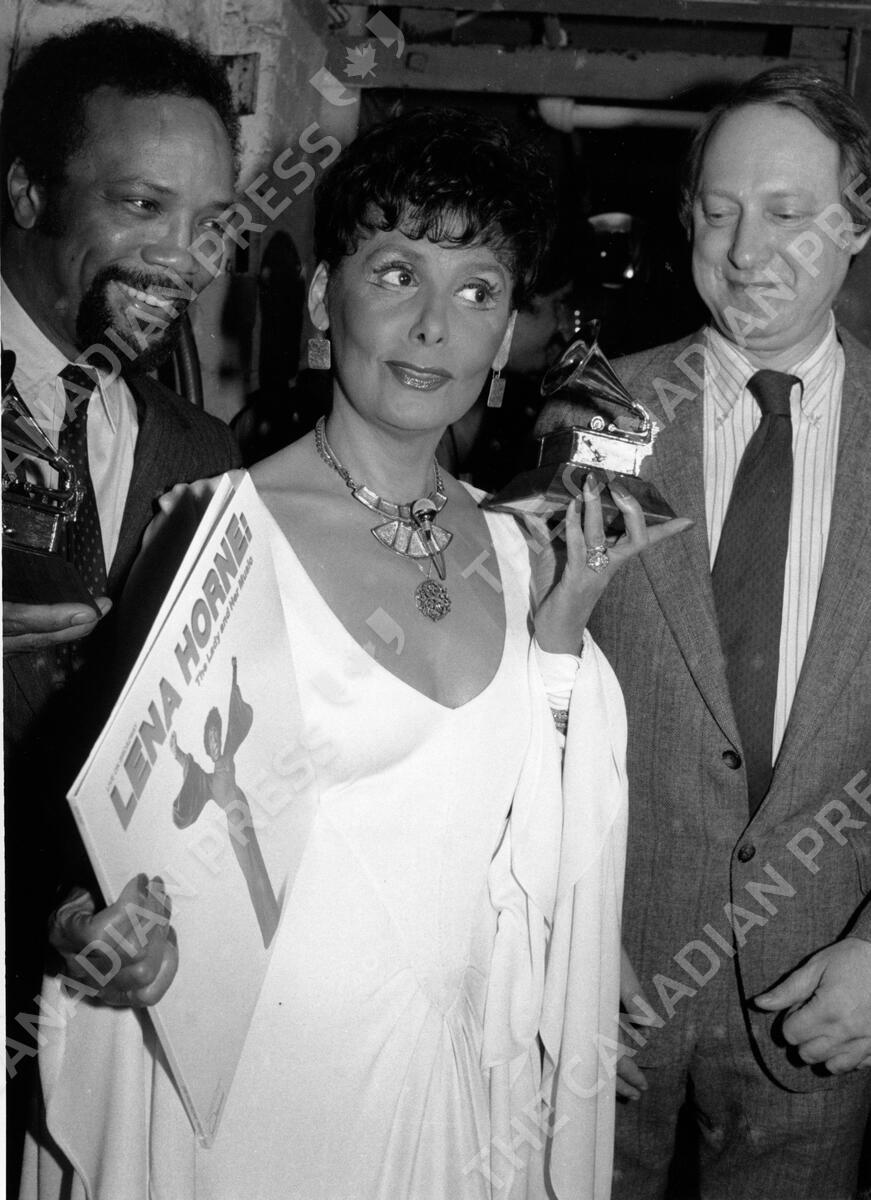 FILE -- In a March 7, 1982 file photo Grammy Award winner Lena Horne, center, is flanked by record producer Quincy Jones, left, holding his Grammy, and Dan Morgenstern, of the National Academy of Recording Arts and Sciences, as she displays her award, and the record that earned it, in New York. Singer Lena Horne, who broke racial barriers as a Hollywood and Broadway star famed for her velvety rendition of "Stormy Weather," has died at age 92. (AP Photo/Ron Frehm/file)