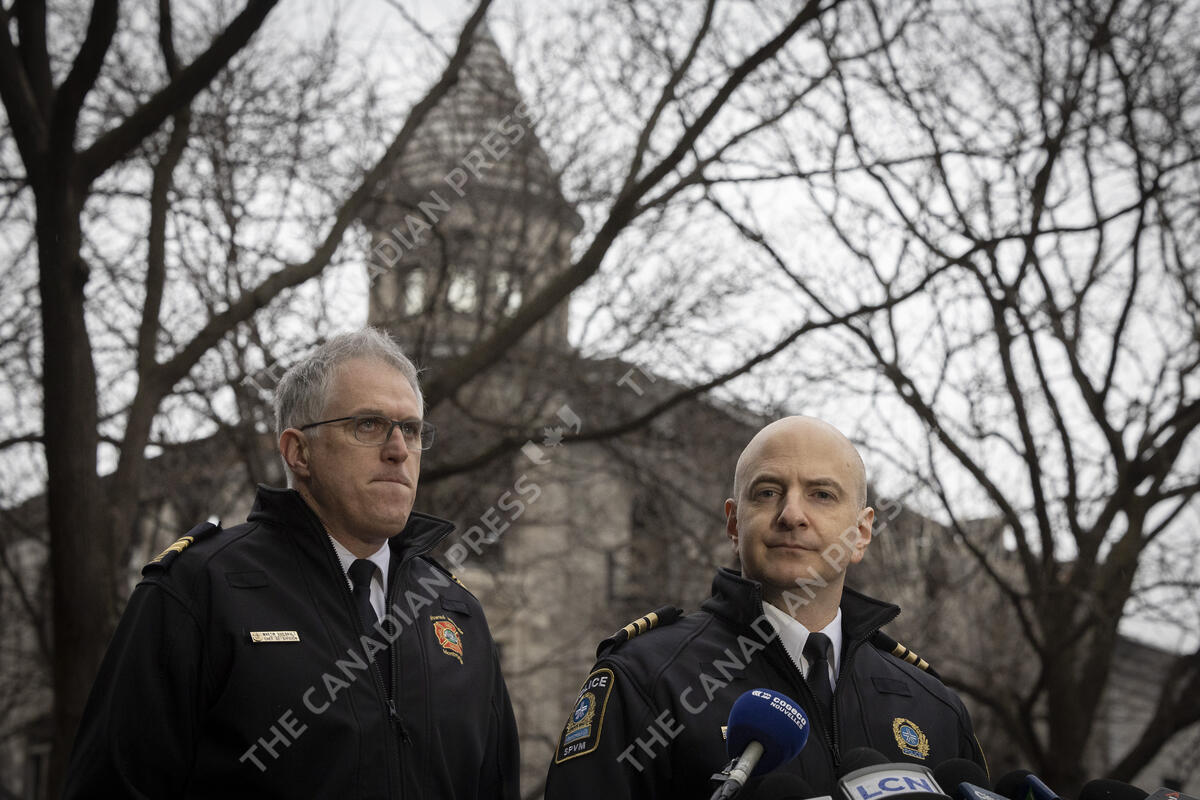 Incendie dans le Vieux-Montréal. Point de presse des autorités sur l’état de la sitiuation. Martin Guilbeault (gauche) du SIM et David Shane (droite) du SPVM