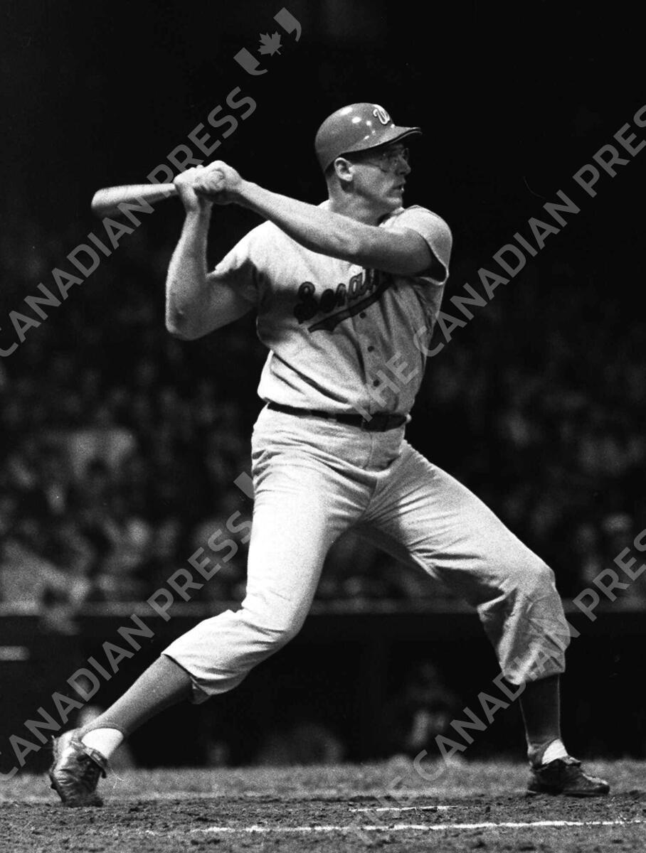 FILE - In this May 18, 1968 file photo, Washington Senators slugger Frank Howard connecting for a ninth inning home run. Howard, the famed Senators slugger, who blew kisses to fans after hitting a home run in that final game in 1971 at RFK Stadium, sees a simpler explanation for New York's 1990s playoff victories over the Rangers. "The Yankees probably had more depth to their ballclub, in other words, they had more good players than Texas did," Howard said. (AP Photo/File)