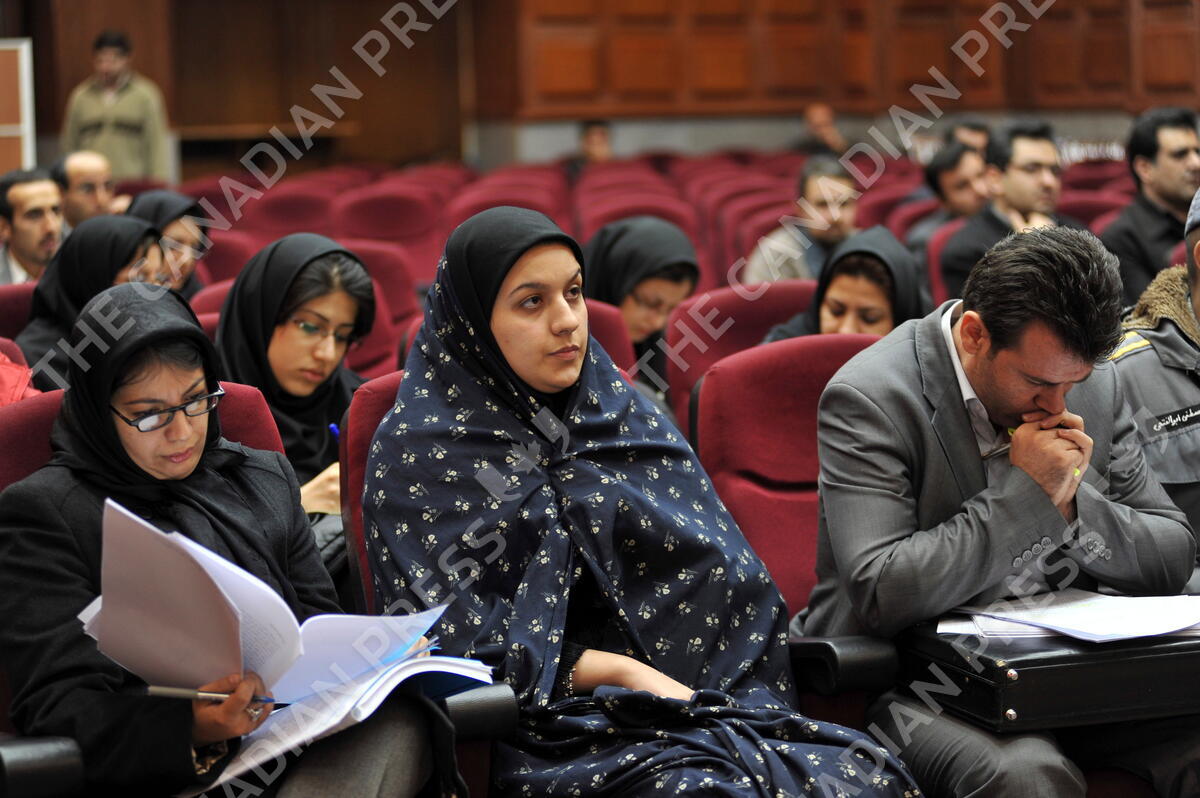 In this picture taken on Dec. 15, 2008, Iranian Reyhaneh Jabbari, center, sits while attending her trial in a court in Tehran, Iran. Jabbari was hanged on Saturday, Oct. 25, 2014, who was convicted of murdering a man she said was trying to rape her, the official IRNA news agency reported. (AP Photo/Golara Sajjadian)