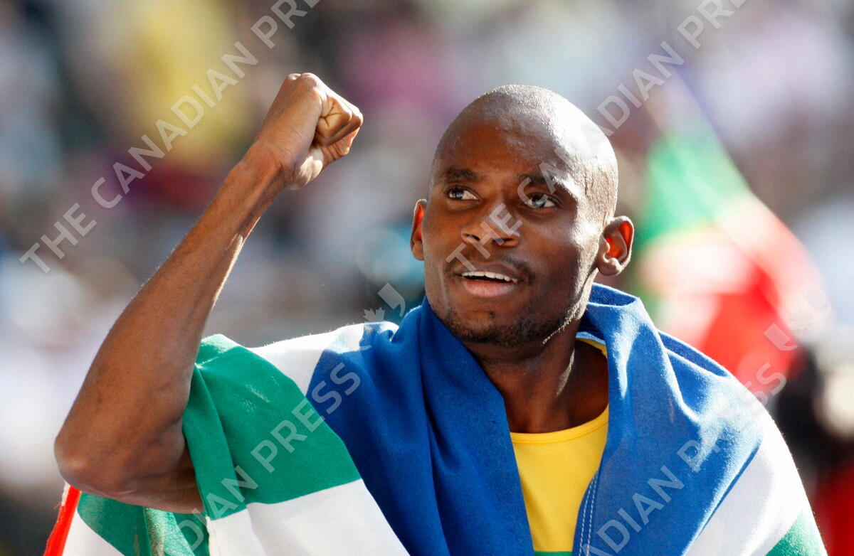 FILE - In this Sunday, Aug. 23, 2009 file photo Mbulaeni Mulaudzi of South Africa celebrates winning the gold medal in the final of the Men's 800m during the World Athletics Championships in Berlin. Former 800 meters world champion Mbulaeni Mulaudzi of South Africa has been killed in a car crash. He was 34. His death was announced Friday Oct. 24, 2014, by the South African Olympic committee and the country’s ruling ANC party, which called him a “flag bearer of our national pride.” (AP Photo/Michael Probst, File)
