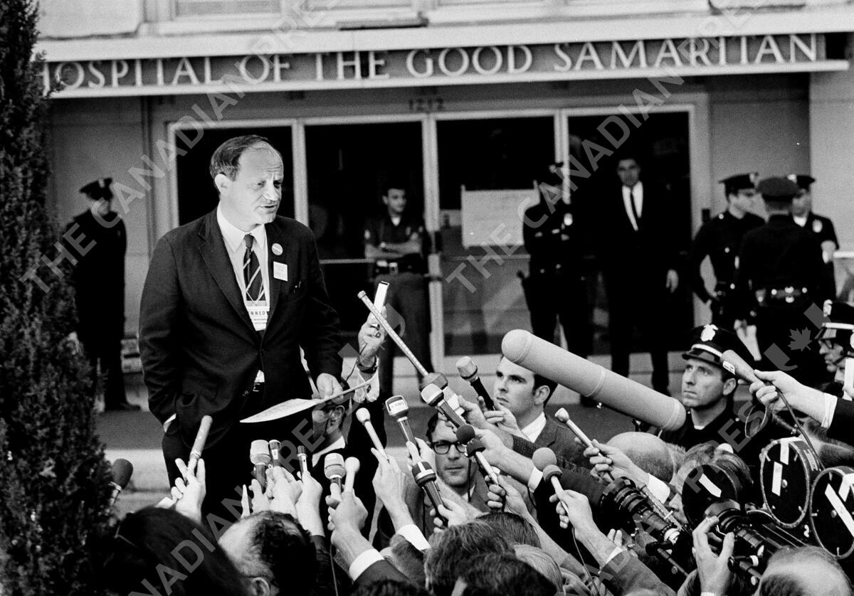 FILE - Frank Mankiewicz, Sen. Robert F. Kennedy's press secretary, tells a news conference outside Good Samaritan hospital in Los Angeles, in this June 5, 1968 file photo that Kennedy emerged from three hours of surgery in "extremely critical condition." All but one fragment of a bullet in Kennedy's head was removed by a team of surgeons. The press secretary who announced the death of Robert F. Kennedy, Frank Mankiewicz, died Thursday Oct. 23, 2014. He was 90. (AP Photo/FILE)
