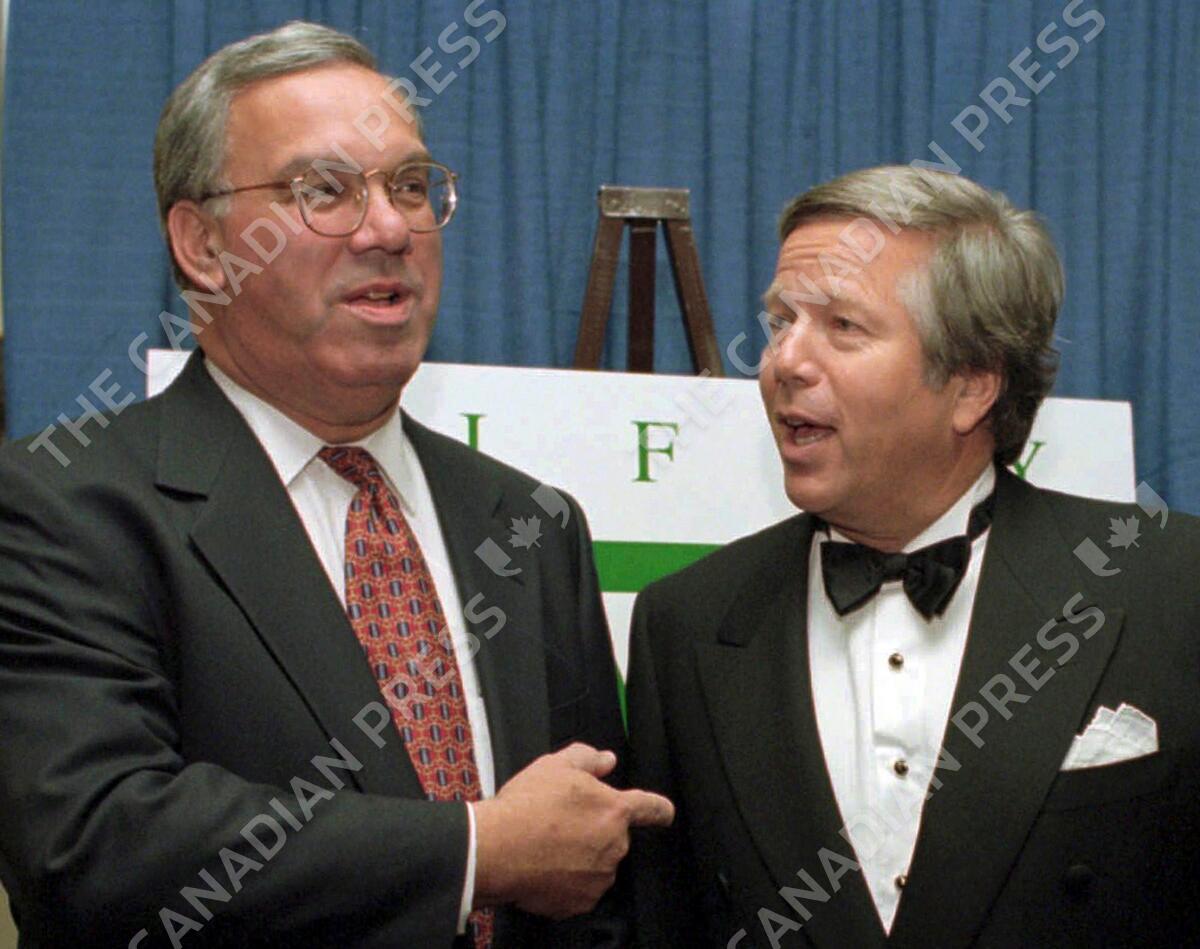 FILE - In this Nov. 8, 1995 file photo, Boston Mayor Thomas Menino, left, talks with England Patriots owner Robert Kraft, right, before a benefit dinner in Boston. Menino, who was diagnosed with cancer a month after leaving office in 2013, died Thursday, Oct. 30, 2014 in Boston. He was 71. (AP Photo/Steven Senne, File)
