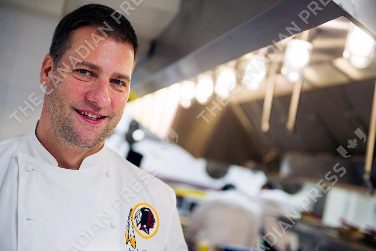 ADVANCE FOR WEEKEND EDITIONS, OCT. 4-5 AND THEREAFTER - This photo taken Sept. 17, 2014 shows NFL Washington Redskins Executive Chef Jon Mathieson in the teams Players Club cafeteria kitchen at Redskins Park in Ashburn, Va. Over the last 13 months, the Redskins have changed the diets of many of its players by converting the basketball and racquetball courts in the Redskins Park basement into a made-to-order, healthy-options eating establishment. There's even a chef with a French cuisine background. (AP Photo/Cliff Owen)