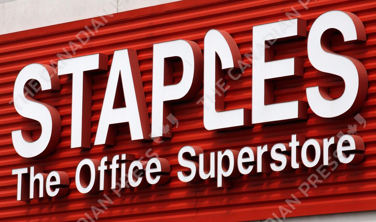 FILE - In this May 17, 2011 file photo, a Staples sign is displayed on the front of a Staple store, in Portland, Ore. Staples is buying Office Depot in a cash-and-stock deal valued at nearly $6 billion. Office Depot Inc. shareholders will receive $7.25 in cash and 0.2188 of a share in Staples Inc. at closing. The deal values Office Depot at $11 per share. (AP Photo/Rick Bowmer, File)