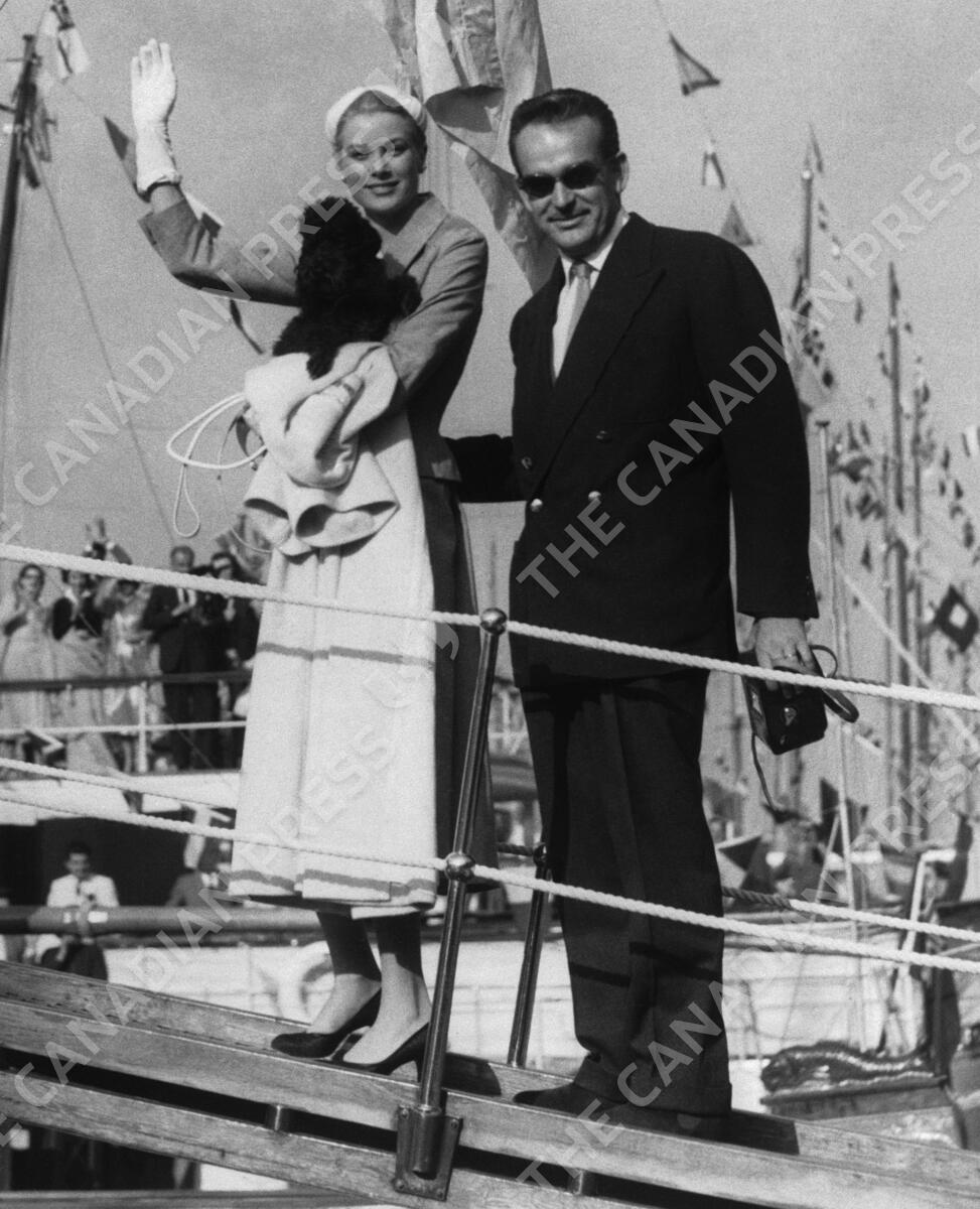 Grace Kelly and Prince Rainier board his yacht, the Deo Muvante 11, in Monaco, on April 19, 1956 to sail for a Mediterranean honeymoon. Oliver, Grace’s pet poodle, goes too. (AP Photo)