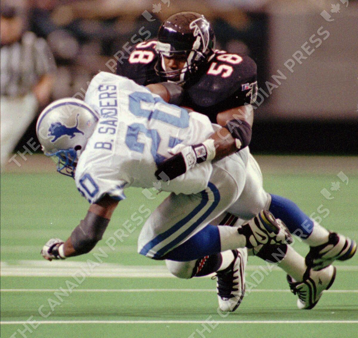 FILE - In this Nov. 5, 1995, file photo, Atlanta Falcons' Jessie Tuggle (58) brings down Detroit Lions' Barry Sanders (20) during an NFL football game in Atlanta. Tuggle knows a thing or two about tackling. They didn't call him the "Hammer" for nothing. When the retired linebacker gets together with other former players, one subject inevitably comes up. These guys today just don't tackle like we used to. (AP Photo/John Bazemore, File)