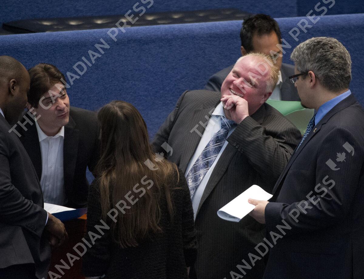Mayor Rob Ford shares a laugh during a council meeting at city hall in Toronto , Ontario, Wednesday February 19, 2014. (Kevin Van Paassen/The Globe and Mail)
