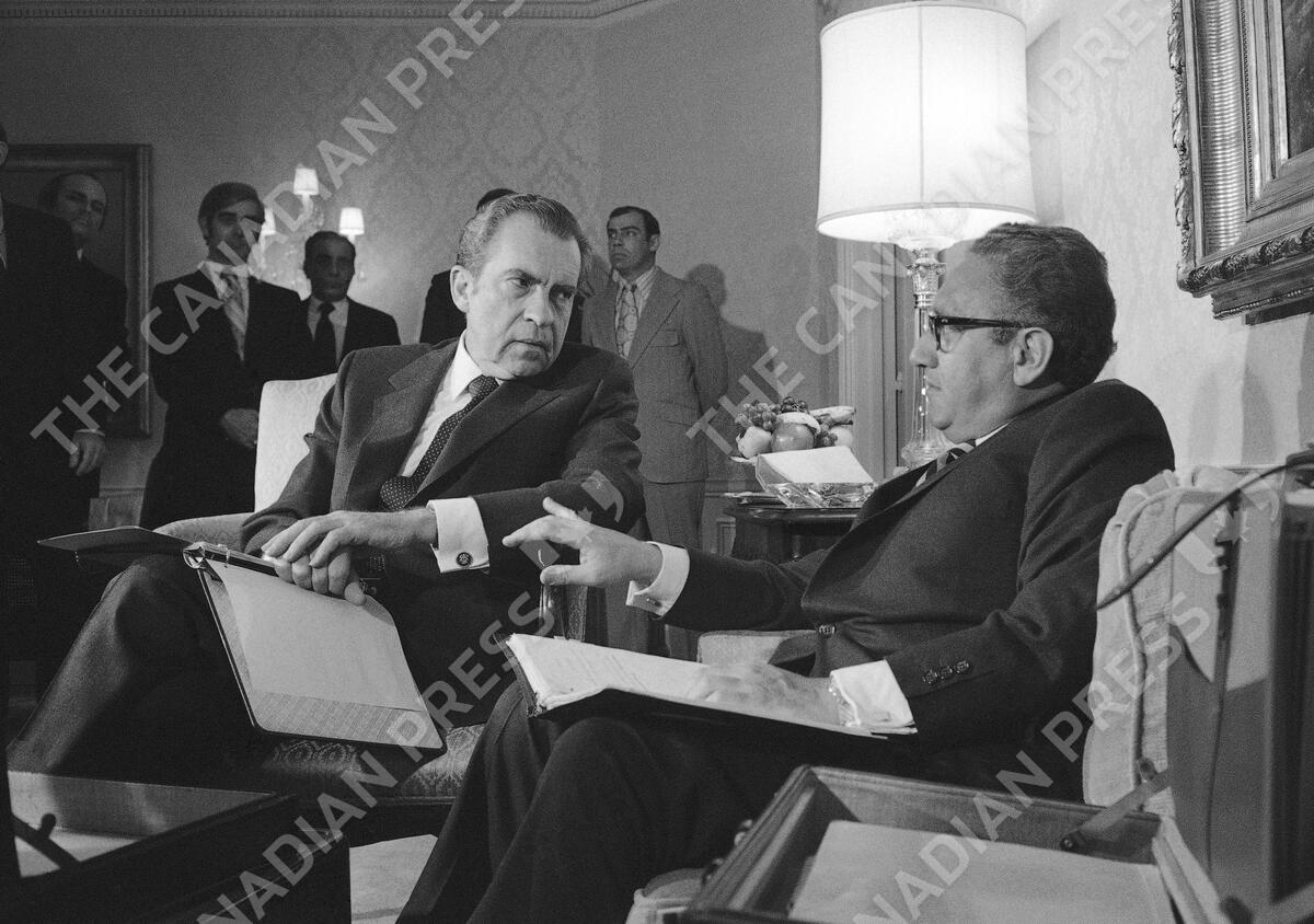 FILE - In this Nov. 25, 1972, file photo President Nixon confers with his adviser Henry Kissinger, right, after Kissinger's return from a week of secret negotiations in Paris with North Vietnam's Le Duc Tho. Forty years after the explosive leak of the Pentagon Papers, a secret government study chronicling deception and misadventure in U.S. conduct of the Vietnam War, the full report is being released Monday, June 13, 2011. The report was leaked primarily by foreign policy analyst Daniel Ellsberg, in a brash act of defiance that stands as one of the most dramatic episodes of whistleblowing in U.S. history. Ellsberg served with the Marines in Vietnam and came back disillusioned. He was a protégé of Kissinger's, who called the young man his most brilliant student. (AP Photo/File)