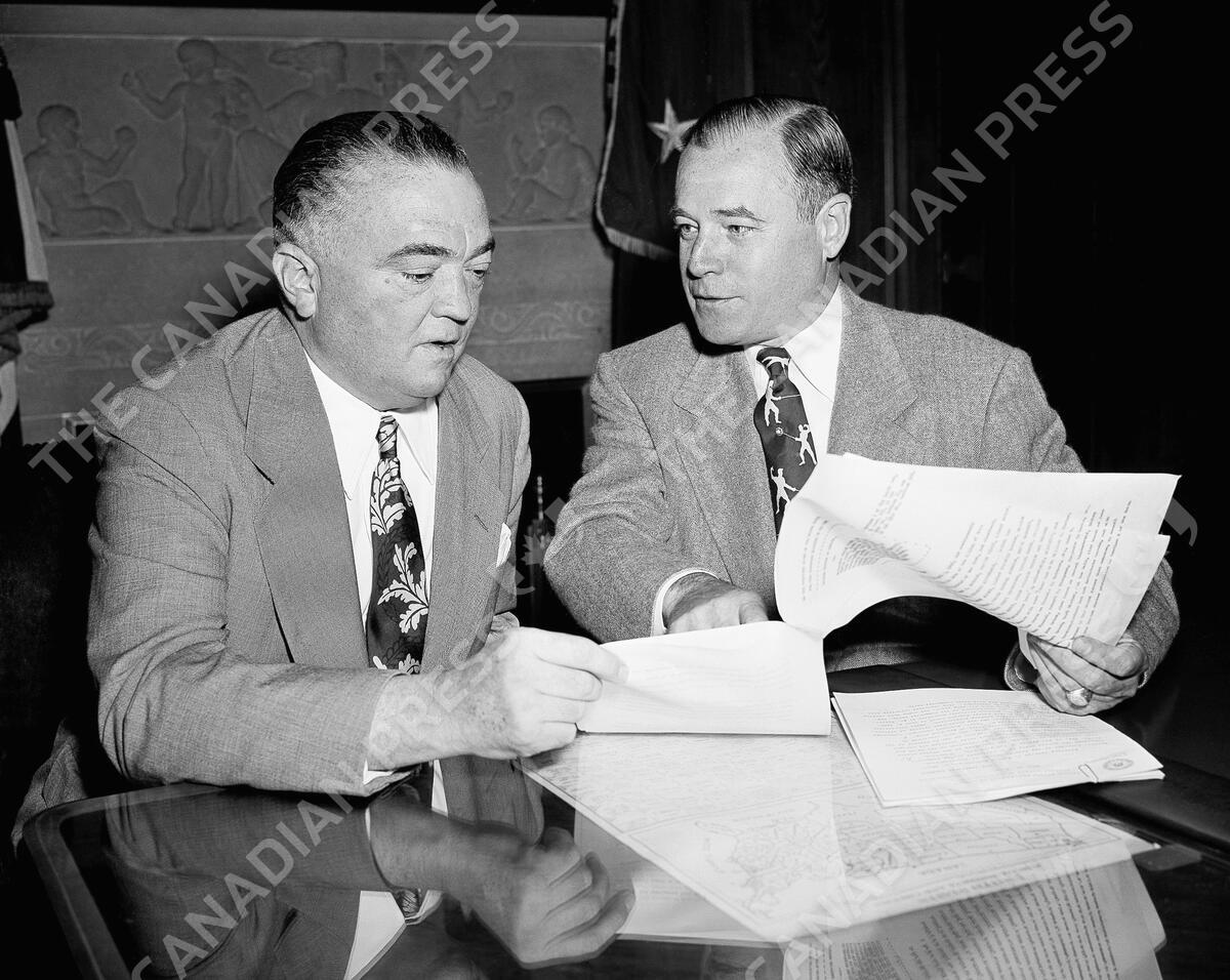 FILE - This June 20, 1951, file photo FBI Director J. Edgar Hoover, left, and Attorney General J. Howard McGrath confer on the government's roundup of Communist party officials in Washington. Each of the 17 seized was described by Hoover as a "prominent, active functionary of the communist party, U.S.A." The FBI charged 17 plus another four they sought out with plotting the violent overthrow of the United States government. In 1950 the Russian invasion of Alaska seem like a real possibility. Hoover teamed up on a highly classified project, code-named “Washtub,” with the newly created Air Force Office of Special Investigations, headed by his one-time protege and former FBI official Joseph F. Carroll. “Washtub” operated from 1951-59, according to Deborah Kidwell, official historian of the Air Force Office of Special Investigations, or OSI. (AP Photo/Byron Rollins)
