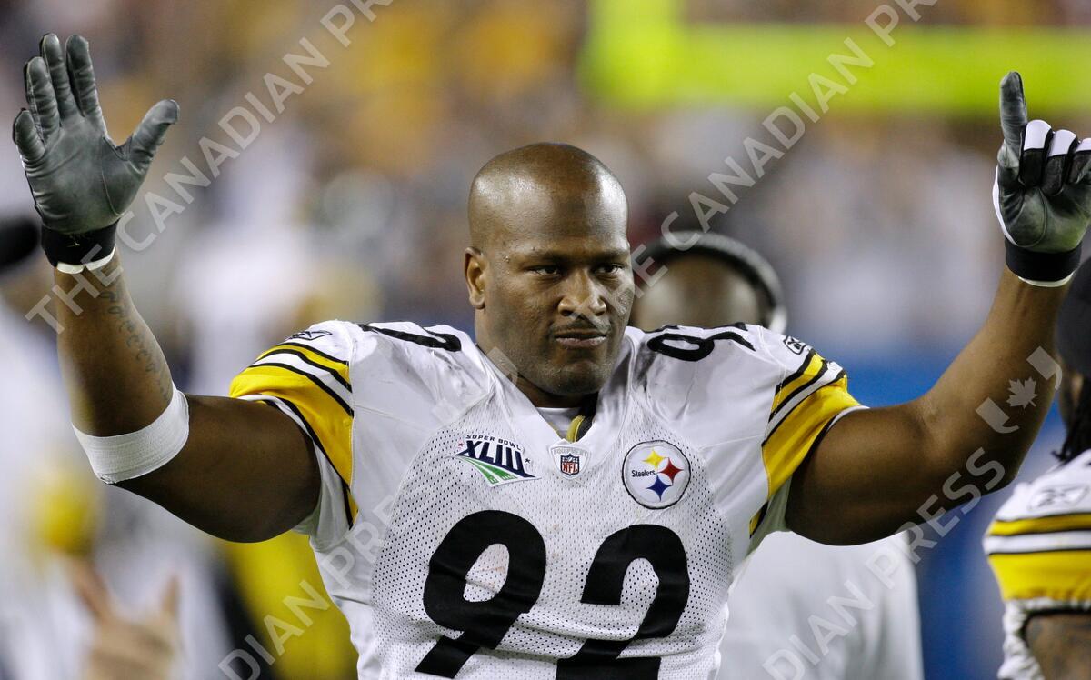 FILE - In this Feb. 1, 2009, file photo, Pittsburgh Steelers linebacker James Harrison celebrates after returning an interception 100 yards for a touchdown during the second quarter of the NFL Super Bowl XLIII football game against the Arizona Cardinals in Tampa, Fla. The former Steelers linebacker is officially retiring on Friday, Sept. 5, 2014, ending an 11-year career that included five Pro Bowls, two Super Bowl rings and numerous run ins with the NFL front office. (AP Photo/Chris O'Meara, File)