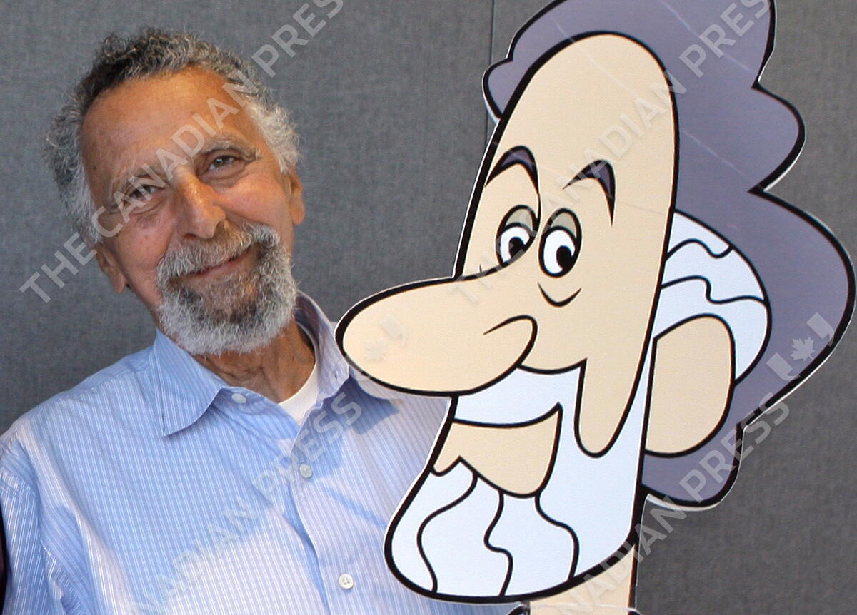 In this June 19, 2008 photo, Tom Magliozzi, co-host with his brother Ray of National Public Radio's "Car Talk" show, poses with a caricature of himself in Cambridge, Mass. NPR says Magliozzi died Monday, Nov. 3, 2014 of complications from Alzheimer's disease. He was 77. (AP Photo/Charles Krupa)